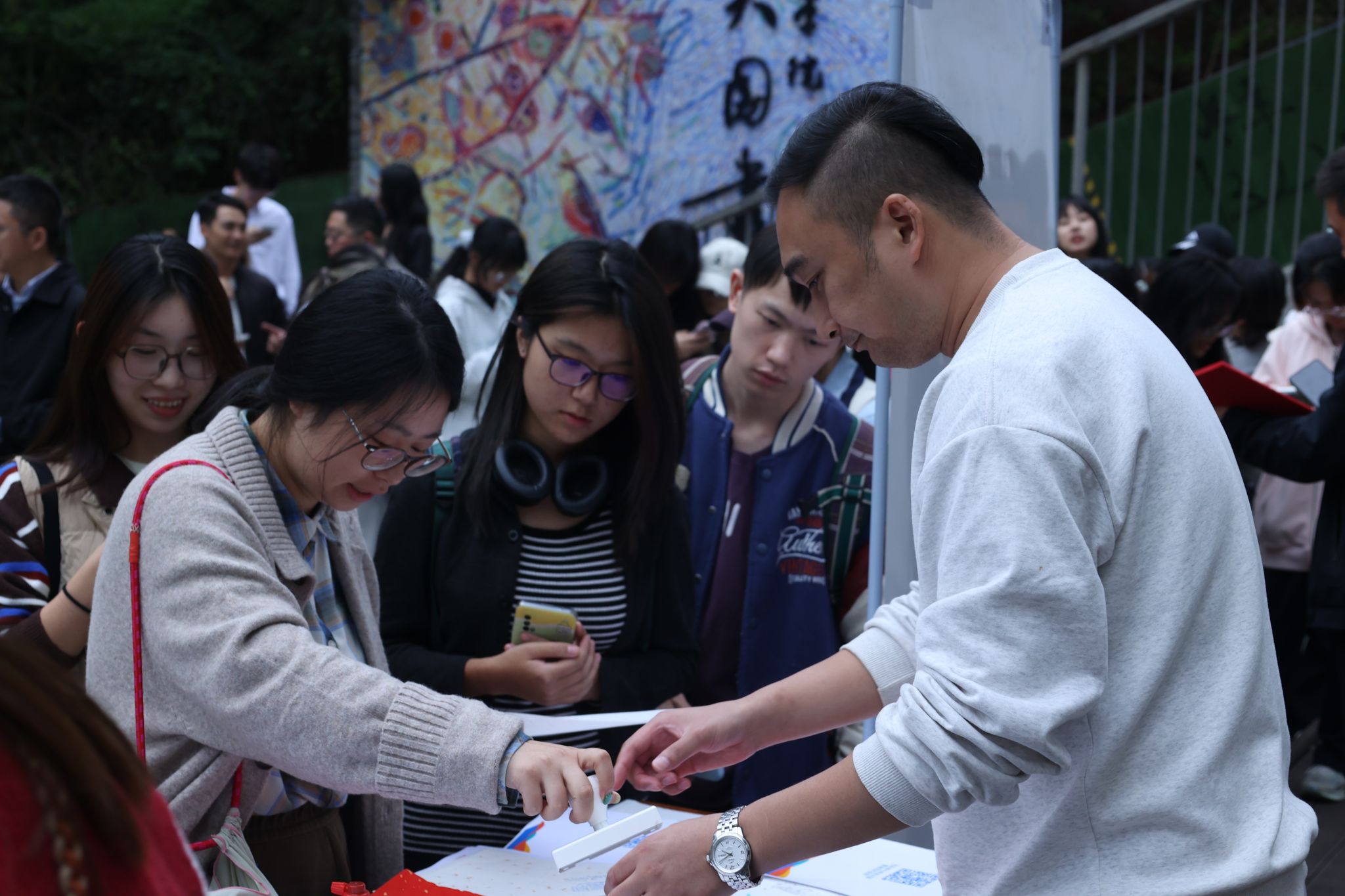 体验与互动环节为师生打造了感知西藏文化艺术的立体课堂。设在图书馆大厅的西藏艺术图书展集中呈现了学校馆藏的西藏艺术相关精品图书,为师生系统了解西藏美术史、唐卡艺术、绘画、文化考古、建筑艺术等提供了学术窗口。联合美育成果展则通过图文形式,生动展现了我校与西藏地区在美育共建方面的实践历程与丰硕成果,体现了学校长期致力于民族艺术传承与社会美育推广的责任担当。现场还设置了藏服体验、藏文“扎西德勒”拓印、西藏主题印章打卡、藏族美食品尝等互动项目,让师生在多元体验中深化对西藏文化艺术的认知与情感。