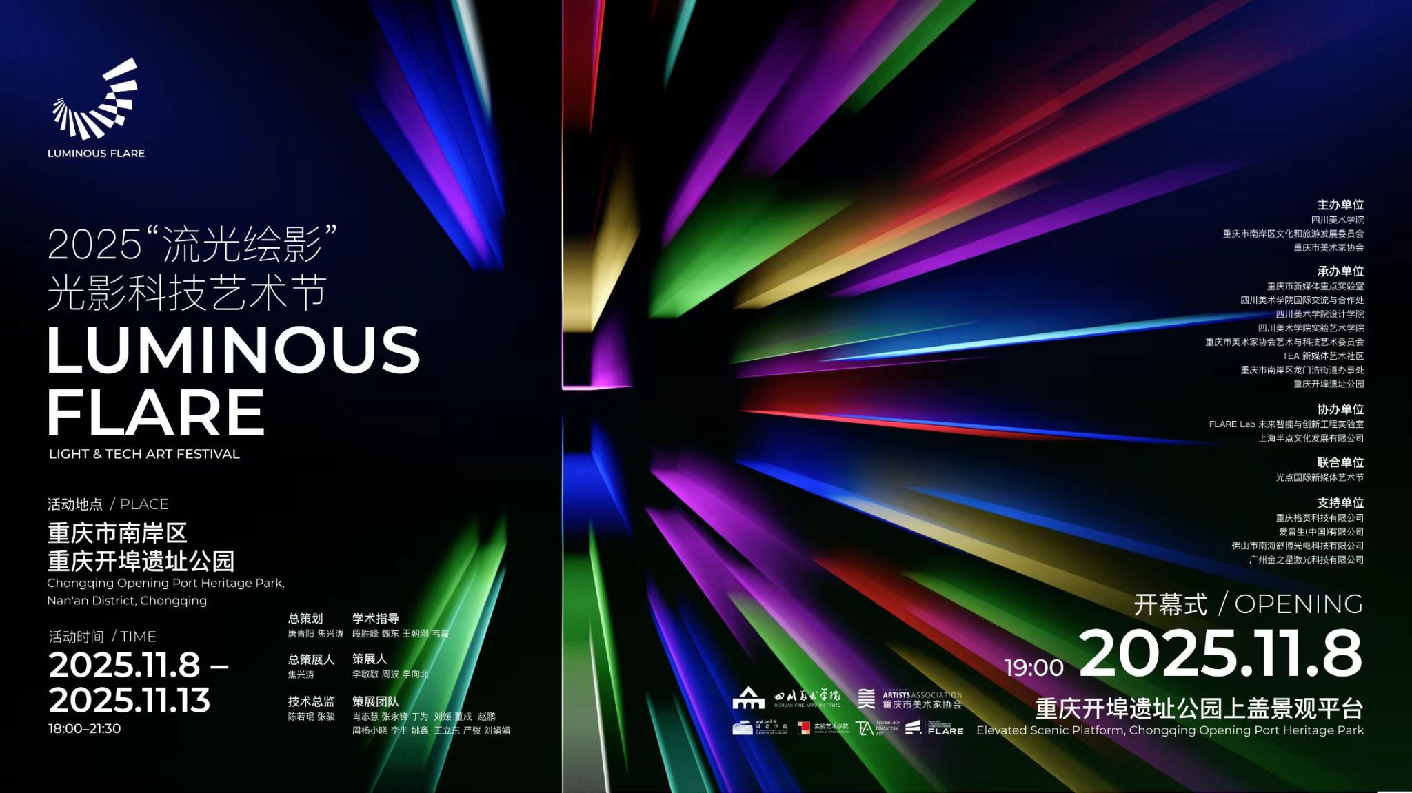 11月8日,由四川美术学院、重庆市南岸区文化和旅游发展委员会、重庆市美术家协会共同主办的2025“流光绘影”光影科技艺术节在重庆开埠遗址公园启幕。学校院长焦兴涛出席开幕式致辞并宣布开幕,党委常委、副院长段胜峰主持。