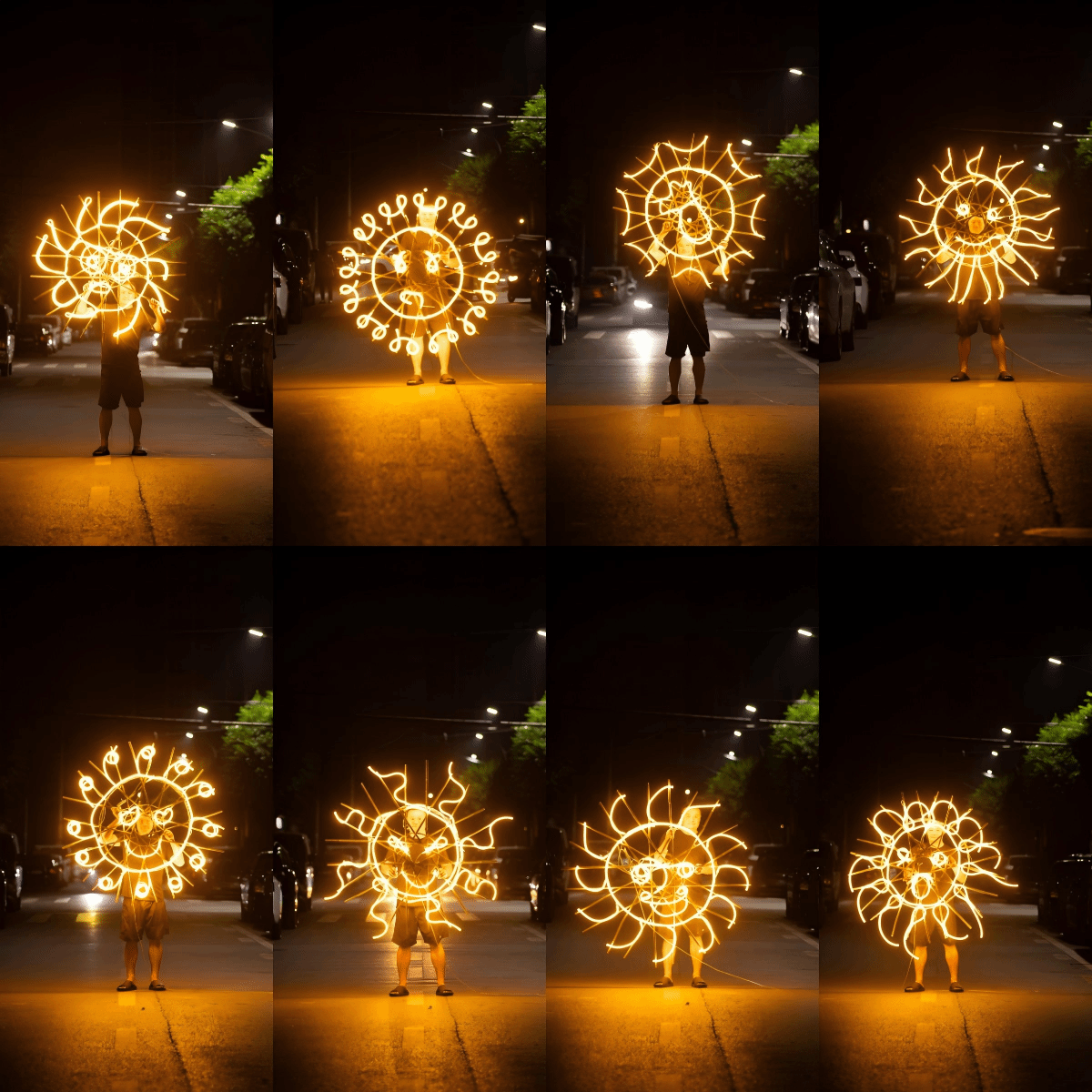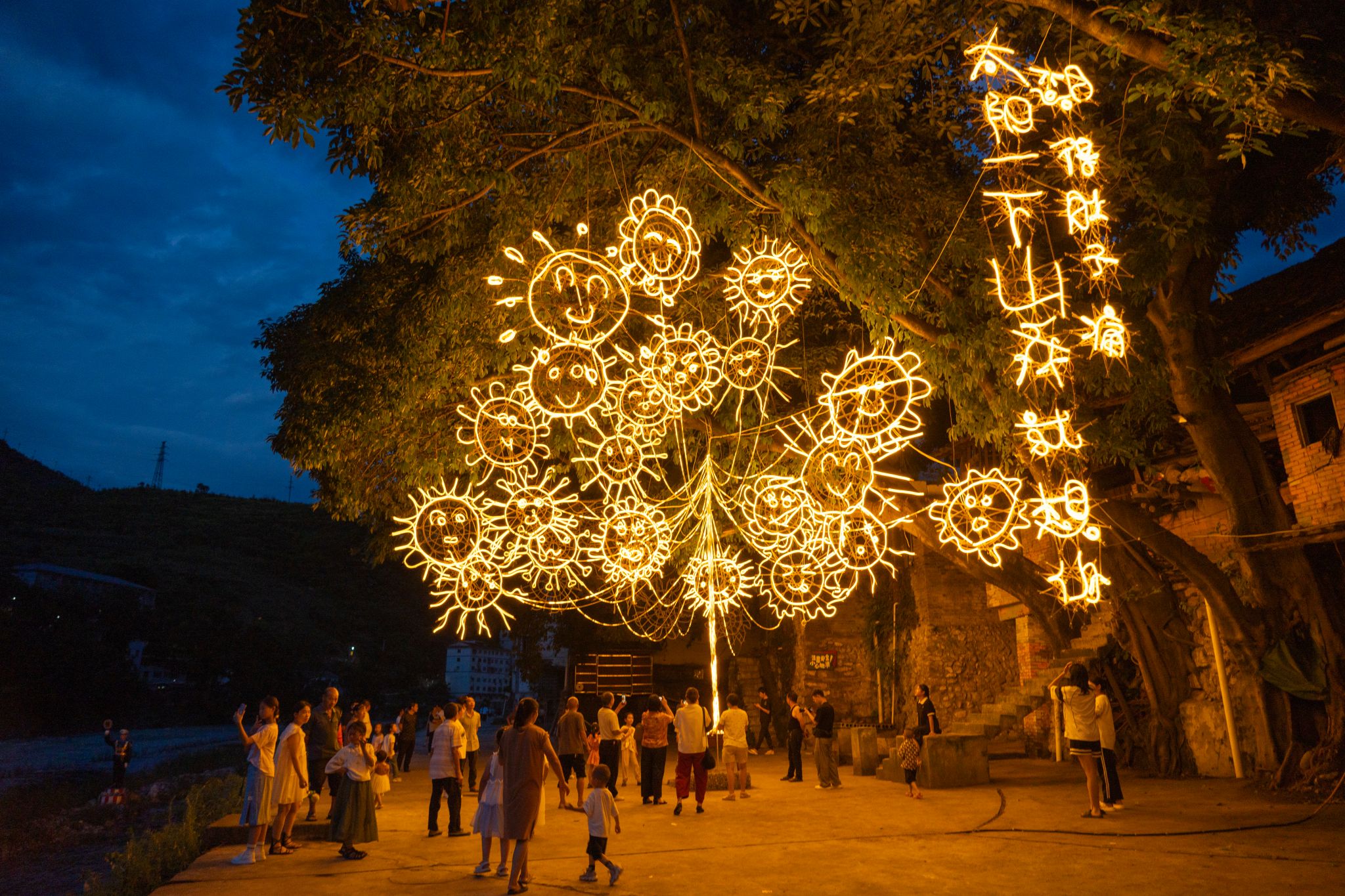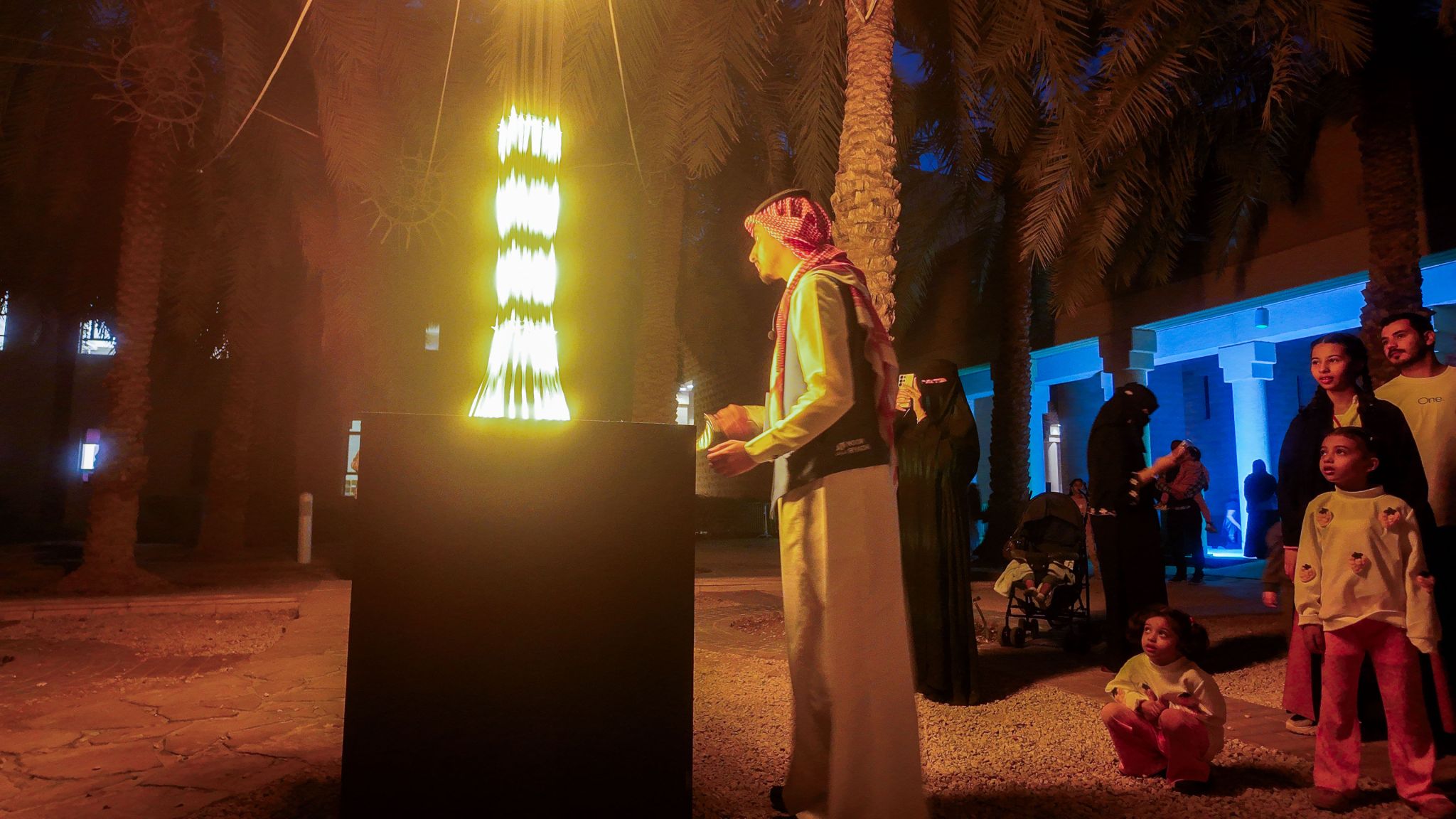 在本届艺术节的重要展区——老皇宫的皇家花园中,张增增呈现了与贵州羊蹬镇社区共创的作品《回家的光》。该作品最初与当地儿童合作完成:孩子们绘制太阳图案,村民利用竹子搭建轻量结构,观众通过手摇发电点亮装置。此次参展,艺术家不仅带来了羊蹬孩子绘制的太阳,还邀请利雅得当地的孩子们共同参与创作,最终共24幅图像被转化为可发光的轻量悬挂装置。当观众手摇发电装置,点点“太阳”在棕榈树影、喷泉水景与夜幕星空间亮起,构成跨越地域的视觉对话。
