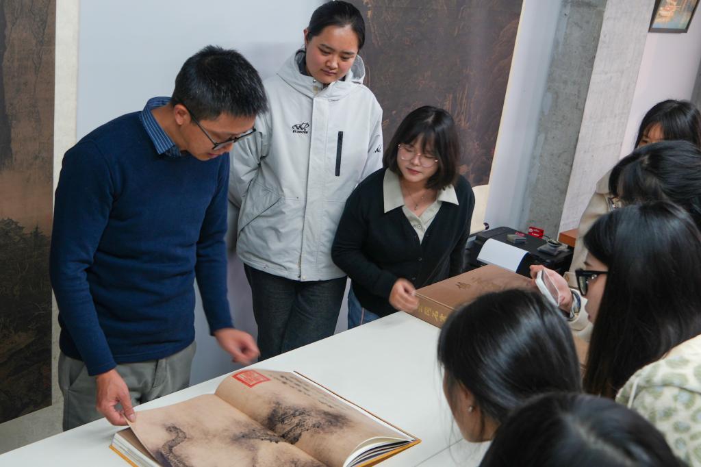 在《如何进行读写实验》课程中,屈波带领工作坊学生们回顾了“读写实验(第一季)”工作坊的开展情况。他带领学生一同前往图书馆特藏室,以现场悬挂的三件古画仿真品《桃源仙境图》《溪山行旅图》《万壑松风图》为例,现场演示了“如何进行读写实验”,鼓励学生们要增加读写训练,逐渐形成建立在感性认识基础上的理性表达的读作品的习惯。