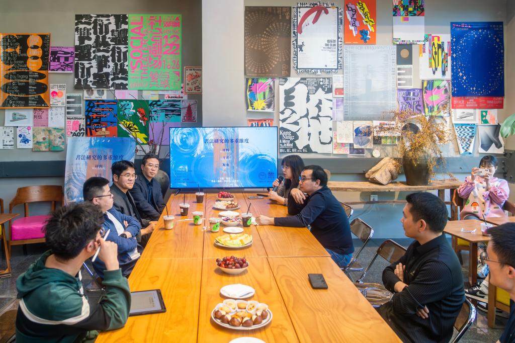 针对这些问题,出席本次沙龙的四位嘉宾分别分享了他们的看法。杨帆认为,当前从事人文社科研究首先需注意于新材料的运用,古为今用。在研究与创作的关系上,杨教授提出无论是硕士还是博士生,都应当要将两者合而为一。对此,杨教授还特别分享了他的宝贵经验——其代表作《清乾嘉时期的〈说文〉学与篆书创作》对其书法篆刻的深刻影响。李阳洪重点分析了古典艺术、现代艺术和当代艺术的区别,以及碑派书法、帖派书法的分类问题。李阳洪认为,中国书法所具有的强烈的本体规定性和独特的精神内涵,是偏重于强烈的美术化特征的现当代艺术所难以具备的,譬如射书之类是否可纳入书法范畴,就颇值得思考。孙恺吉探讨了艺术学科的相关价值,指出书法虽然实际应用价值不高,但其独有的艺术审美文化,却有提升涵养、陶冶情操的社会功能。同时指出目前对于20世纪书法篆刻艺术史的研究成果虽众,但往往具有脸谱化和作品铺陈的弊端,因此还有重新撰写的必要。李永分析了书画“鉴藏”的概念,指出“鉴”当包含真伪之别的“鉴定”与优劣之别的“鉴赏”两层意思。“藏”则指书画的庋藏、流通、著录。认为书画鉴藏的研究,当从书画之鉴定、鉴赏、庋藏、流通、著录等方面入手,综合应用历史学、文献学、社会学、艺术学等研究方法,客观再现历史文化事件,还原历史本来面目。对谈最后,与会师生还就“书法的本体研究”“中国哲学美学视野下的中国书法观念研究”“中西文化比较视野下的中国书法文化研究”等9个话题展开了热烈讨论。