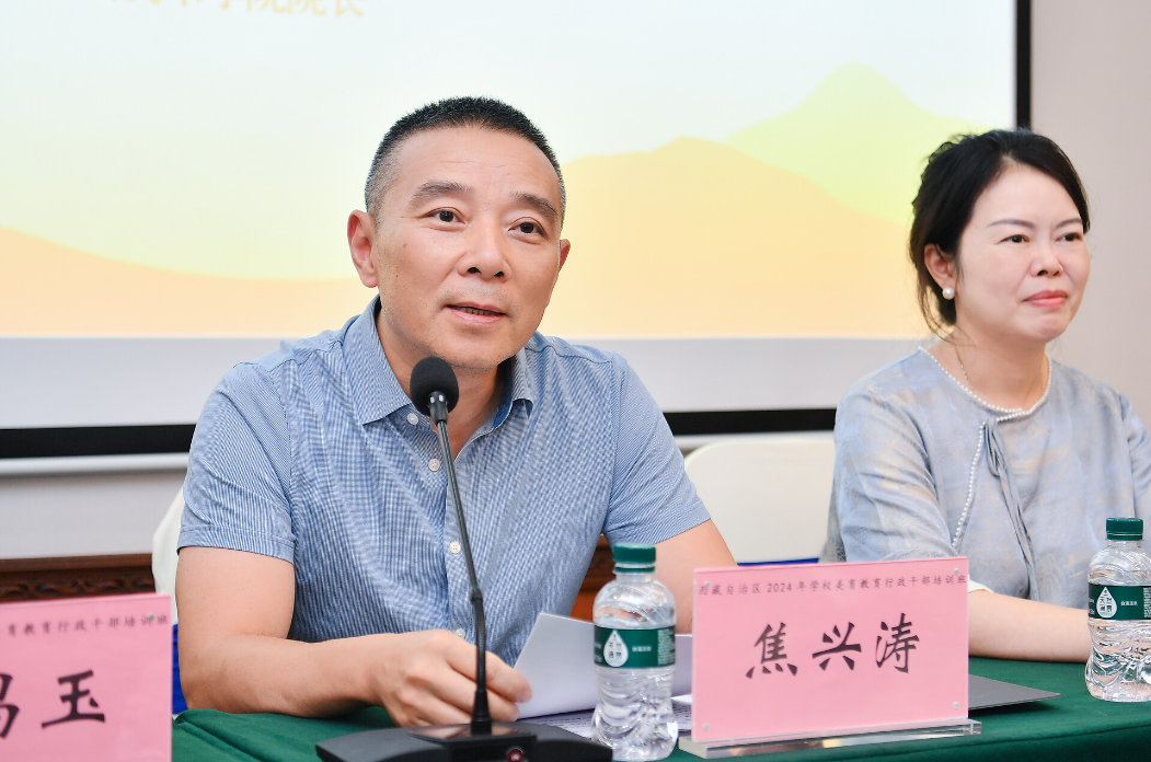 在结业典礼上,四川美术学院院长焦兴涛致辞。他高度评价了本次培训活动的深远意义与积极影响,认为此次培训不仅深化了参训人员的教育理念并推动了其实践应用,还对西部美育建设起到了积极的推动作用。他提出了关于未来西部美育建设的“三项建议”与“三个期望”,呼吁川藏两地加强文化交流与合作,让美育的桥梁跨越地域界限,共同构建新时代美育教育事业的美好未来。
