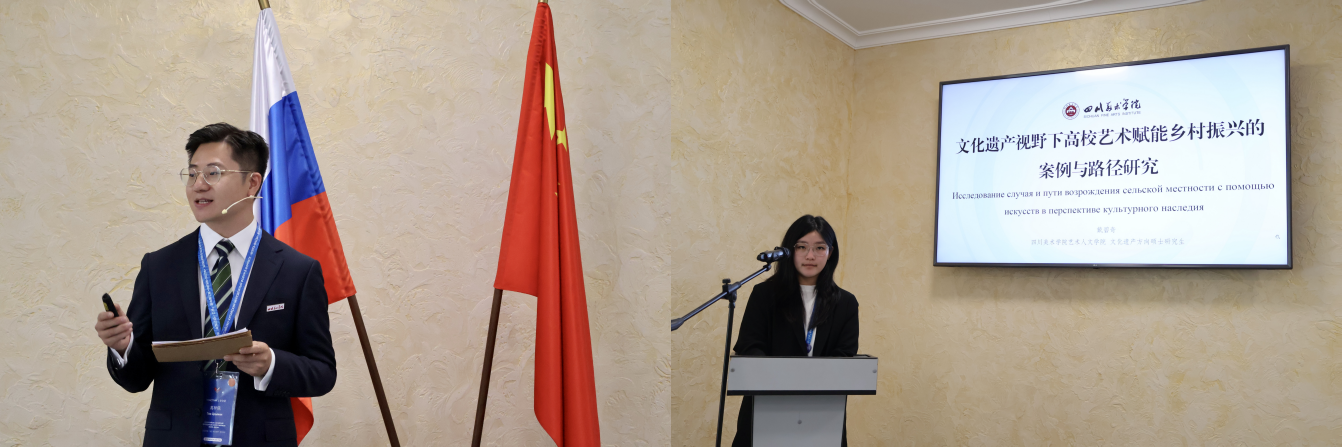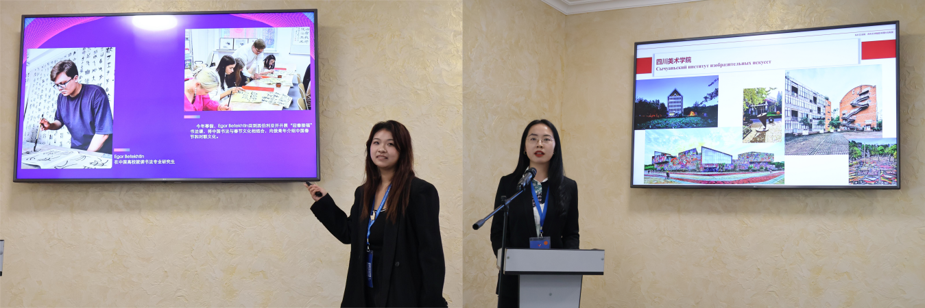 在萨拉托夫国立法学院,重庆代表团参加“中俄两国青年政治的发展方向”主题研讨会。我校中国画与书法艺术学院教师陈奂、造型艺术学院博士李莹、设计学院博士高梓铭、艺术人文学院硕士戴碧奇分别围绕艺术赋能、非遗文化、书法艺术、乡村振兴等主题与中俄青年代表进行多维度、多角度的深入交流和探讨,互学互鉴,进一步加深了中俄青年的相互了解和友谊。