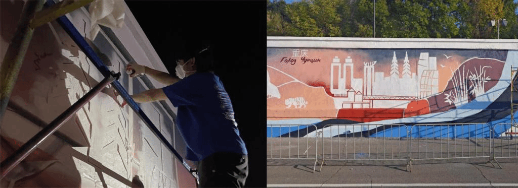 论坛期间,组织“长江·伏尔加河——伟大友谊之河”涂鸦活动,中俄青年代表参与涂鸦创作。我校造型艺术学院教师刘宇轩为重庆创作主题涂鸦。