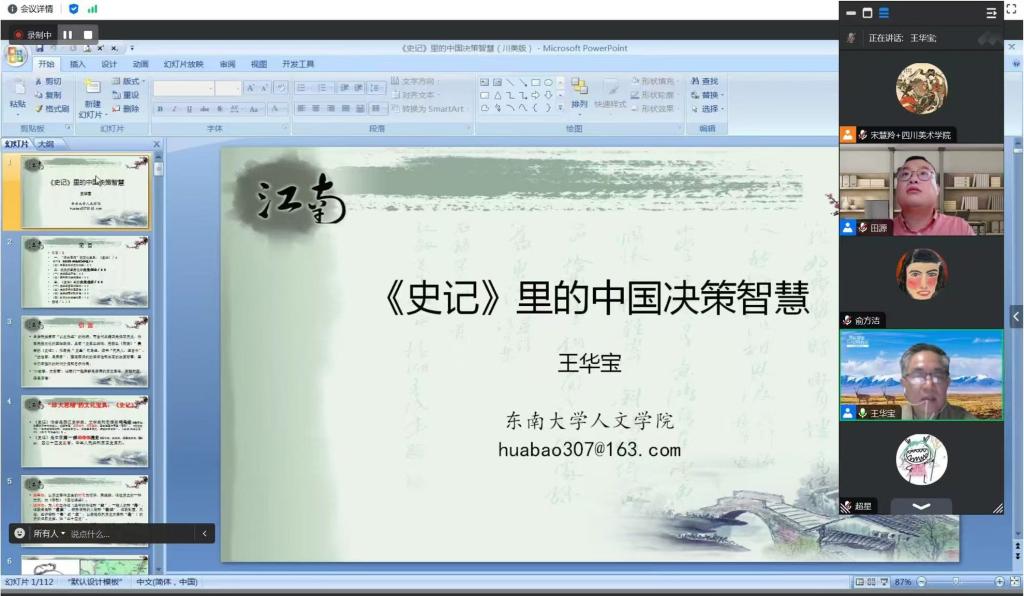 本期课程讲座题目为《〈史记〉里的中国决策智慧》,主讲人王华宝,东南大学人文学院教授、博导,历史系主任。具有“史家之绝唱,无韵之《离骚》”美誉的《史记》,作者是“史圣”司马迁。该书“究天人,通古今”“述往事,思来者”,展现中国史学的优良传统,蕴涵着深刻的思想性和丰富的决策智慧,至今仍有强烈的时代价值和启示作用。