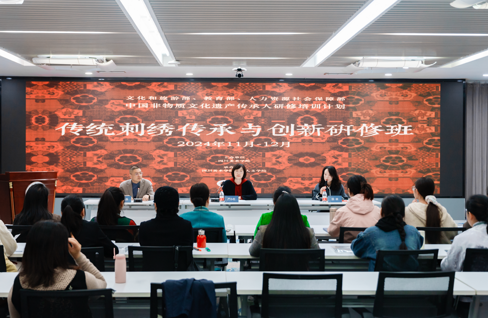 11月17日上午,四川美术学院2024年“中国非物质文化遗产传承人研修培训计划——传统刺绣传承与创新研修班”举行开班仪式。这是四川美术学院参与文化和旅游部、教育部、人力资源和社会保障部“中国非物质文化遗产传承人研修培训计划”以来举办的第十三期研修班。重庆市文化和旅游发展委员会非物质文化遗产处处长严小红、四川美术学院艺术人文学院党委书记杨茂森、全体参训学员和艺术人文学院教师代表参加了开班仪式。项目负责人、艺术人文学院艺术与文化遗产系主任侯波主持开班仪式。