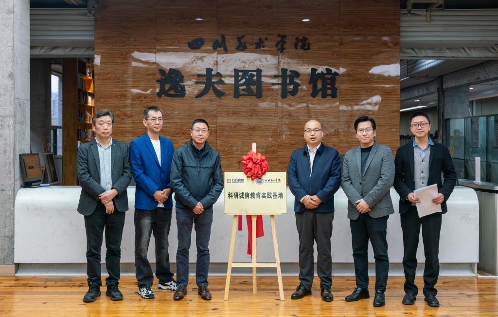 讲座结束后,师生移步图书馆大厅进行“科研诚信教育实践基地”揭牌仪式。学校党委常委、宣传部部长贾安东,图书馆馆长杨吟兵,图书馆副馆长屈波,万方数据成都子公司总经理吴启迪,万方数据科研诚信事业部副经理张严民,创作科研处与图书馆相关老师及各二级学院科研秘书和科研助理参加了揭牌仪式。