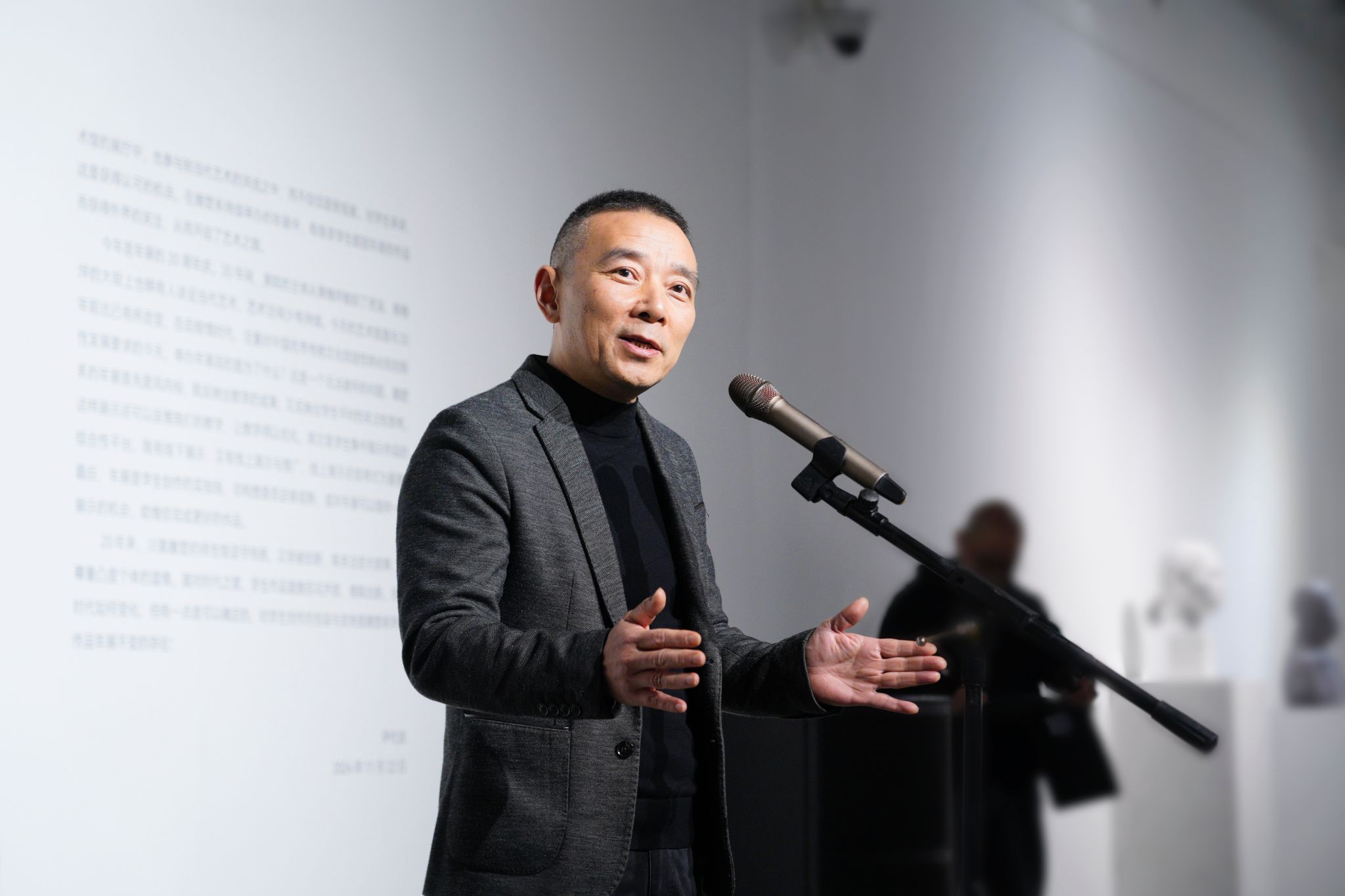 获奖学生代表贾庭凯发言。他感谢雕塑系年展这个平台与所有赞助者们的支持,能够让立志成为艺术家的人拥有一个可以自由表达思想的平台。希望今日参展的各件作品能激励仍在观望且尚未大胆创作的同学们,因为思想的波涛需要沉降,时间不等闲,不要让年轻的思想随时间消逝。