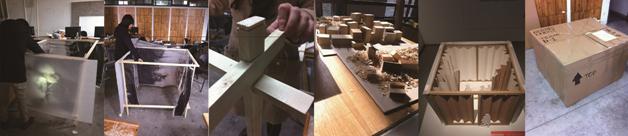 2013 年 11 月 20 日——27 日,工作营师生在四川美术学院建筑艺术系开始了为期一周的研究设计工作。在各校教师的指导下,参与学生针对复杂的都市课题,超越传统红线区间作业的习惯,不仅仅是在图纸上画图,而是走入基地进行足尺试验。以达成重视地景特性、更具善意的设计目标,尝试寻找属于城市策略的第三条道路——以最微小的建设程度,精微、精巧、精准的设计,实现环境的改善。学生以选题分组,制作了各自的方案展板和模型。