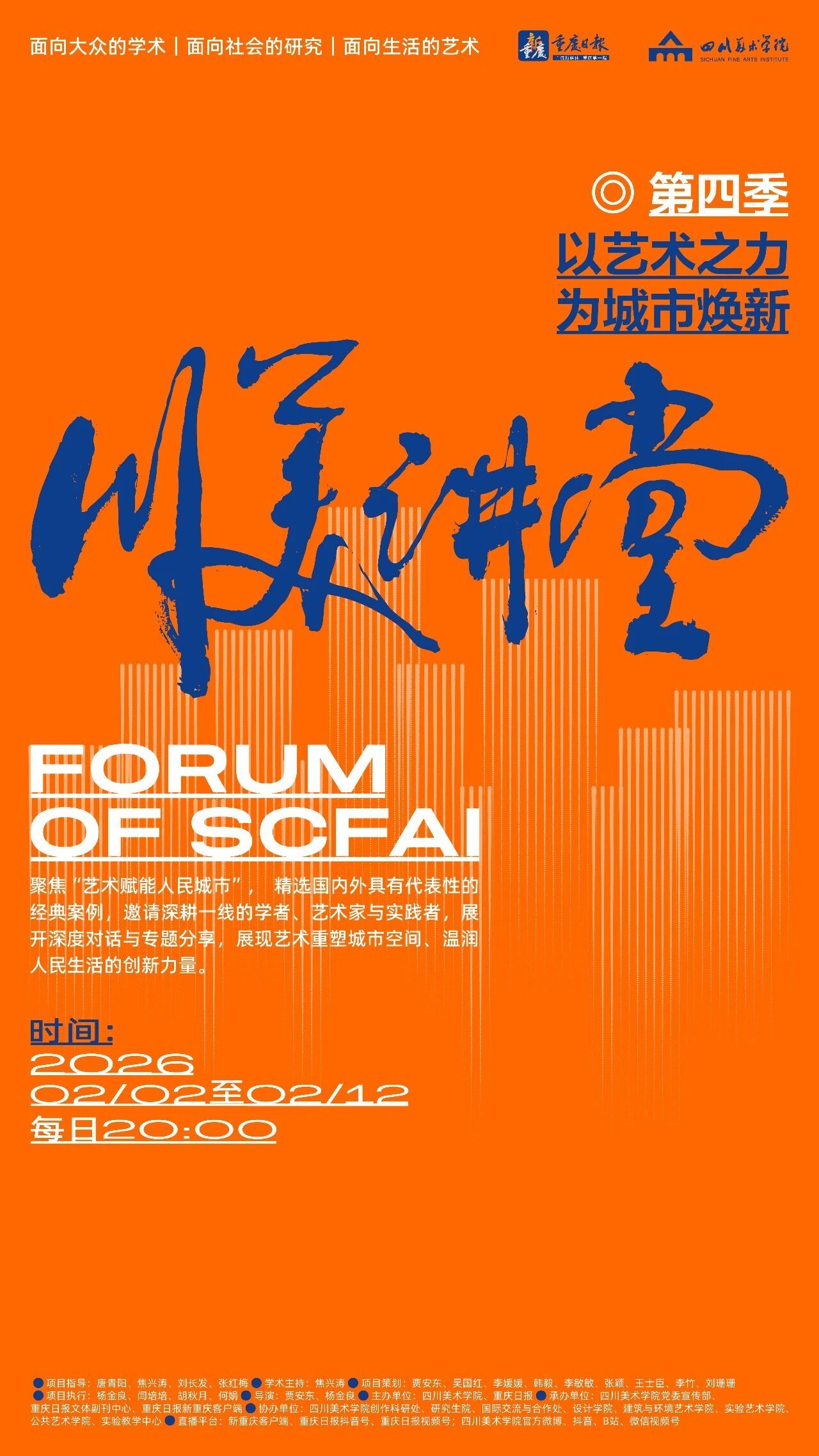 共享名师智慧,畅游艺术殿堂。2026年2月1日—12日,由四川美术学院、重庆日报联合打造的“川美讲堂”第四季重磅上线,创新采取“艺术+传媒”新模式,邀请国内外艺术名家走进演播室,开设“无界”课堂,打通社会美育的“最后一公里”,将专家之学“接地气、有人气、增底气”地呈现在公众面前。截至目前,相关融媒体产品的全网传播量达到1150多万次,受到众多专家教授、文化学者、媒体人士、网友读者的热议和点赞。