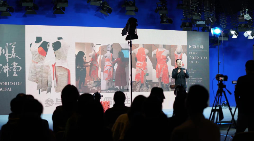 直播中,苏永刚以“时尚概念与设计可持续”为题,通过对设计经历的图案、工艺美术、艺术设计、艺术与科技(交叉学科)四个发展阶段的梳理,深入探讨了时尚概念与设计可持续。