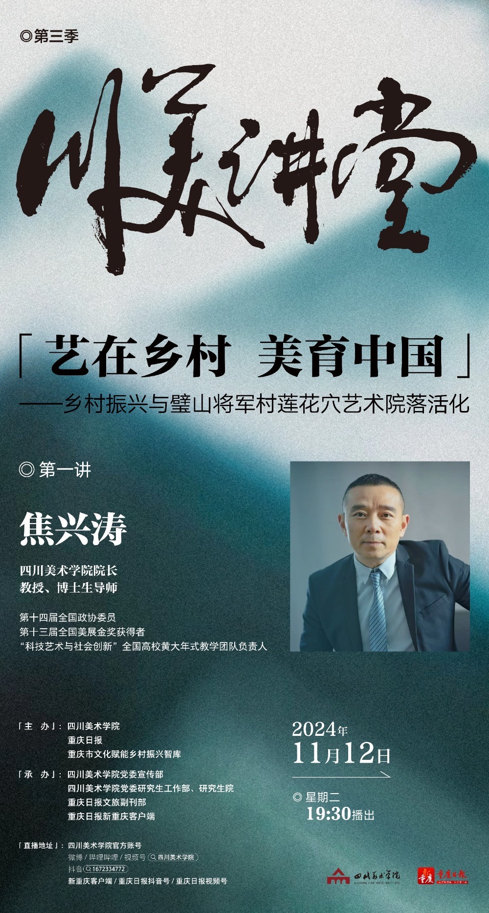 共享名师智慧,畅游艺术殿堂。11月12日起,全新升级的川美讲堂第三季再起航,邀请到焦兴涛、潘召南、王天祥、曾令香、娄金等多位名师出镜,走进他们亲自参与的艺术乡建项目,以鲜活的典型案例、精准的理论解析,探讨艺术赋能乡村的“N种”范式,助推乡村全面振兴。