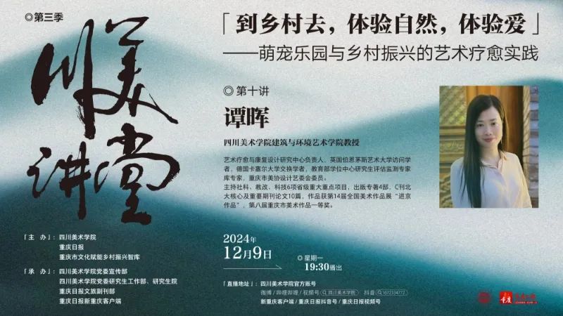 “在这里,动物是主人,小朋友们来,是拜访自己的朋友的。我们不是在打造一个乐园,而是一个理想!”12月9日,川美讲堂第三季第十讲上线。四川美术学院建筑与环境艺术学院教授、硕士生导师,四川美术学院艺术疗愈与康复设计研究中心负责人谭晖以《到乡村去,体验自然,体验爱——萌宠乐园与乡村振兴的艺术疗愈实践》为题,结合其设计的朵拉萌宠乐园,分享了乡村艺术疗愈这一前沿话题。