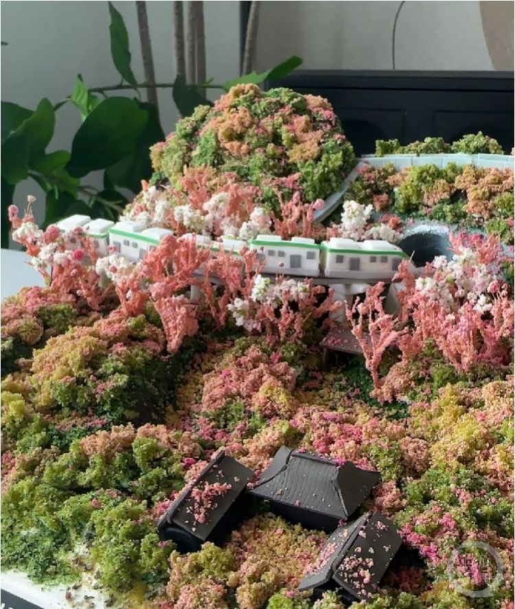 花了近一天的时间,司女士用翻糖和蛋糕胚制作了树、列车、轨道等配件,接着花了近8小时制作了蛋糕,整个蛋糕制作周期长达2天。司女士回忆:“当时最难的点在于如何用蛋糕把重庆春天的美表达出来,佛图关公园现场红色、粉色、深绿色、浅绿色等各种颜色我得一一进行还原,例如山体的颜色,我就用了四五种蛋糕胚来还原。”