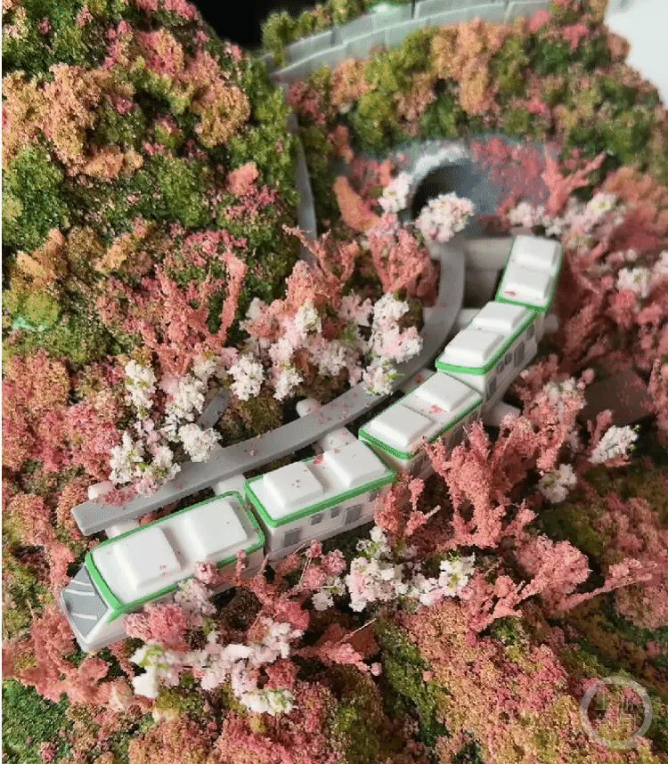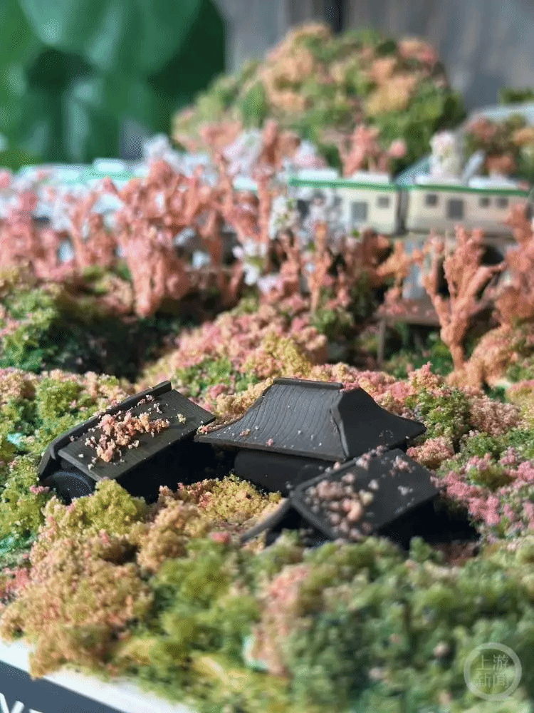 花了近一天的时间,司女士用翻糖和蛋糕胚制作了树、列车、轨道等配件,接着花了近8小时制作了蛋糕,整个蛋糕制作周期长达2天。司女士回忆:“当时最难的点在于如何用蛋糕把重庆春天的美表达出来,佛图关公园现场红色、粉色、深绿色、浅绿色等各种颜色我得一一进行还原,例如山体的颜色,我就用了四五种蛋糕胚来还原。”