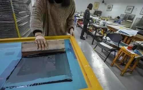四川美术学院版画系丝网版画工作室,同学正在印刷版画。