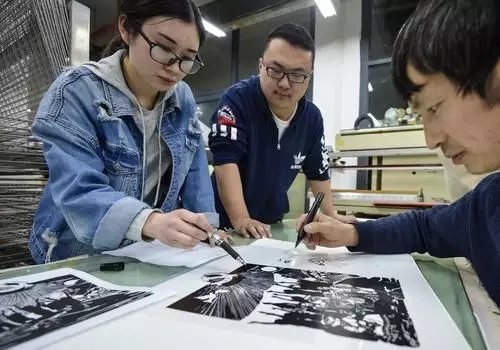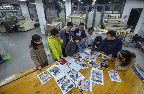 2018年3月15日,四川美术学院版画系丝网版画工作室,师生们正对丝网版画作品做最后修改。