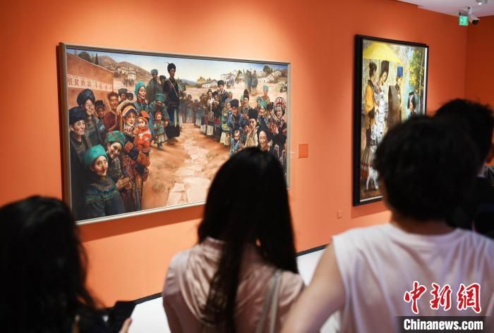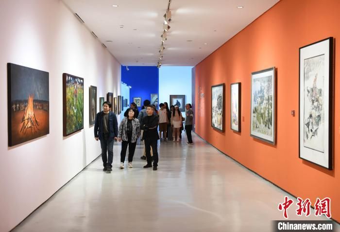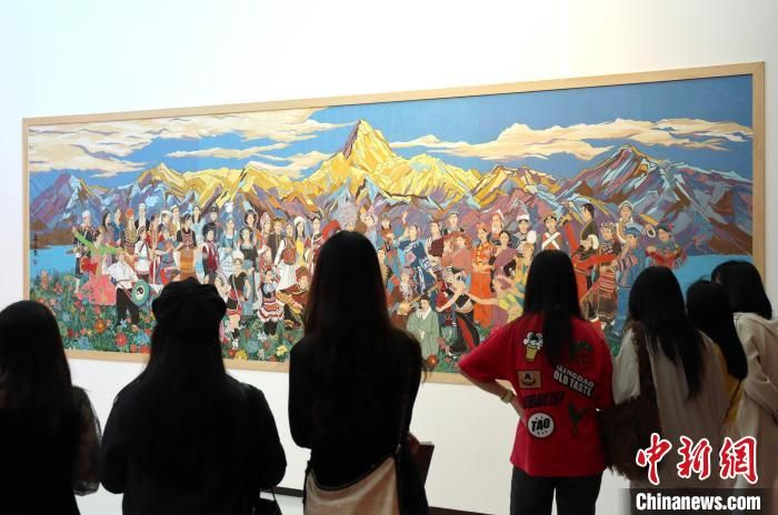 图为中国画作品《五十六个民族是一家》吸引参观者驻足欣赏。中新社发 董炜 摄