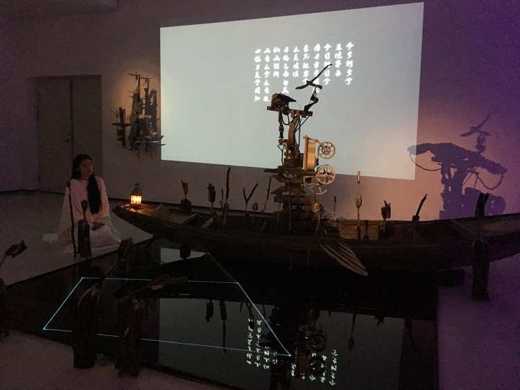 伴随着埙演奏出的乐声,视频中出现了烟雾缭绕的画面,机器人也发出了声音。视频前方的“墨池”中有一艘船,女子在绕着“墨池”缓慢行走,如极光般美丽的片状激光从裂缝中投射出来。这正是SIGMA艺术小组的综合材料作品《悬界》,走进这件作品,观众们好像进入了一个剧场,正在欣赏一场声、光、电结合的演出。