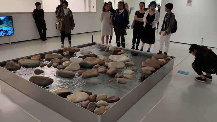 时子媛的作品《回响室》就颠覆了大众的认知,因为在她的作品中,“石头”竟然漂浮在了水面上,随着水流的带动,“石头”碰撞还发出了悦耳的叮叮咚咚声。当然作品中的“石头”不是真正的石头,“这是我用陶瓷烧制的,用了传统的翻模烧造,里面是空心的,所以能浮在水面上。”时子媛回忆,她有一次烧制了一块很大的“石头”,自己扛着回家,在路上有阿姨忍不住来给她点赞,说你这个女孩子劲也太大了。