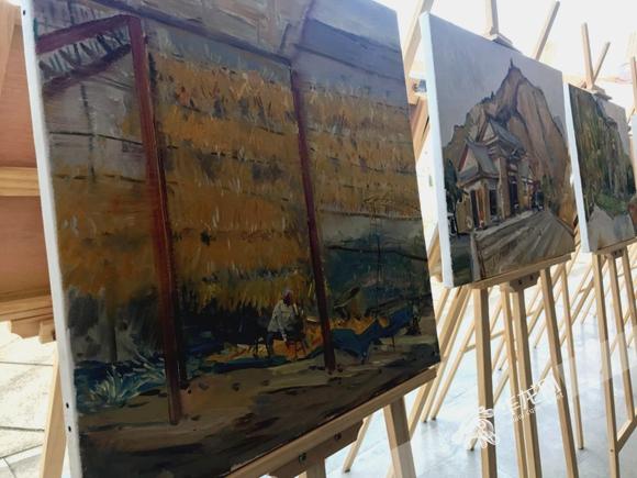 油画系的杨贤也参加了这次采风。出身农村的他总是更关注乡村题材,于是他创作了一副题为《丰收》的作品。“石椅羌寨很美,每家每户都种着月季花。”杨贤说,《丰收》的创作灵感来源于恰好看到一位老人在院子里用新式的机器分玉米粒,满墙都垂着金灿灿的玉米,色彩和画面都让人印象深刻,反映出当地人欣欣向荣的新生活。他在现场即兴创作,用印象派画法将这一刻记录下来。