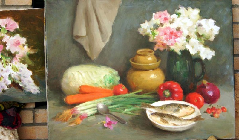 中间那幅画稍大一些,画了四五天,也是坐在现在这个位置画的。画布上有鲜花、抹布、泡菜坛、红海椒、葱子、胡萝卜、白菜、两条在盘子里的鱼,以及一个勺子和勺子边的一朵小花。这些东西安静地躺着,它们真实得不可思议,鱼好像马上要跃出盘子,而勺子呢,我伸手就可以把它拿起来,白菜像我昨天在菜市场买来的。我看着这幅画,刚才还那么安静躺着的东西,突然轻微晃动起来,类似于塞尚所说的“颤动”。