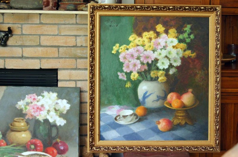 到处是油画。客厅、书房、墙壁、墙角,有的一排排挂起,有的堆在桌上,还有的立在墙边……客厅右侧墙边立着的三幅静物画,皆为今年新作,不是刘国枢最擅长的人物画。其中一幅裱好了,中间那幅还未收笔,边上一幅尺寸最小,就一朵花。“本来有四幅,一幅被拿去展览了。”他说,没说原因。