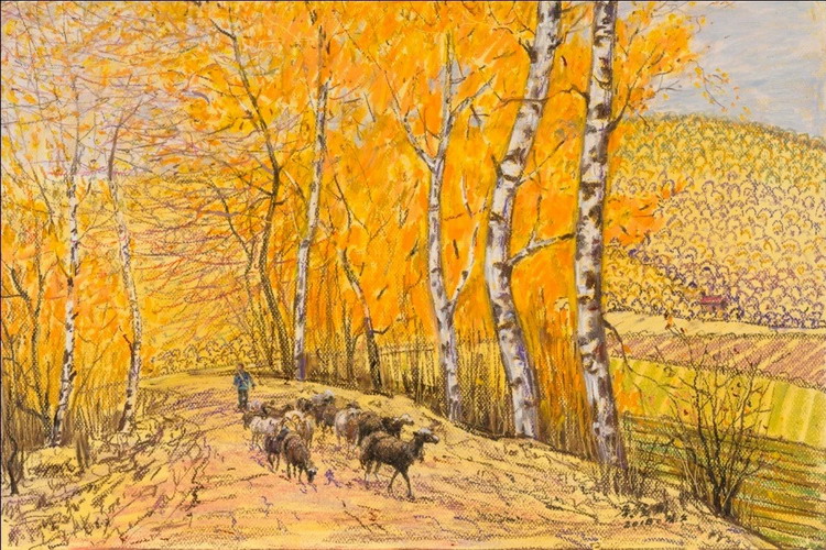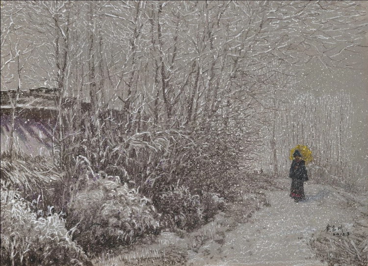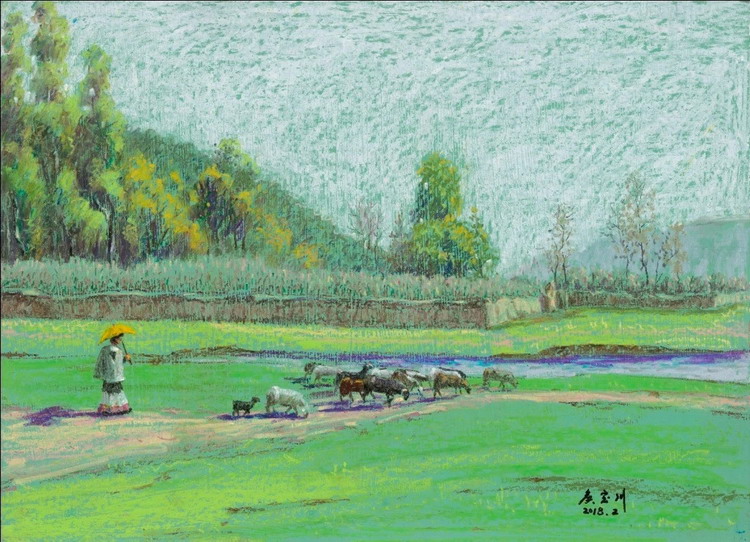 春天的大凉山一片翠绿,溪边牛羊成群;夏天的大凉山阳光明媚,绿阴初蔽林塘路;秋天的大凉山金黄繁茂,草木黄落归牛羊;冬天的大凉山白雪茫茫,山林更显静谧……走进展厅,看完侯宝川的作品,仿佛走过了大凉山的四季。上游新闻·重庆晨报记者在现场看到,展览的作品分为“春”“夏”“秋”“冬”四个部分,都是侯宝川最新创作的油画棒作品。“用油画棒来创作,对我来说也是一种新的尝试,这次展览正好可以跟众多高手交流和学习。”侯宝川谦虚的说到。