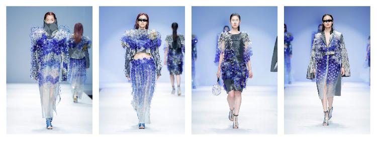 西南大学在该时装周中获人才培养成果奖,该校2015级服装与服饰设计专业学生唐一鑫荣获面料运用奖(专项奖)。她将亚克力作最小单位进行结构组合,再用高温机器和专属染料对材料进行热变形与渐变,并通过多面采光设计展示光纤在未来材料中的作用,以体现信息时代瞬息万变。