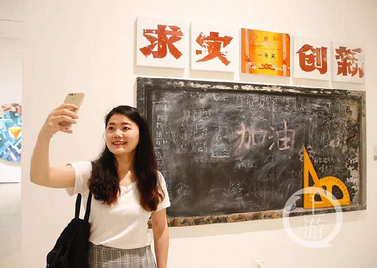 一走进川美美术馆一号展厅,一面“黑板”出现在了上游新闻·重庆晨报记者眼前,上方四个大字“求实创新”,一下子就将观众带回到学生时代。走近仔细一看,这其实不是真正的“黑板”,包括裸露的红砖、脱落的墙皮、老师的教具还有奖状,都是曹丹丹用笔画出来的。