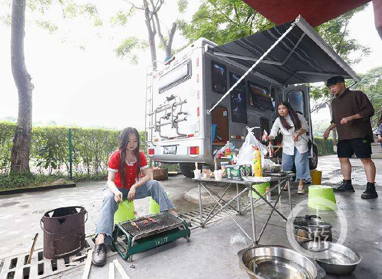 一辆房车停在一旁,遮阳棚已经打开,烧烤炉也生好了火,甚至已经能够闻到烤串的香味。没错,这里还是“开放的六月”的展场,不是露营地,这正是新媒体艺术系毕业生方越的毕业创作。