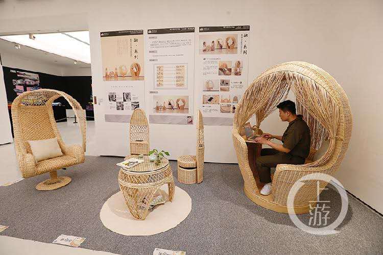“这把椅子要是放在阳台上多舒服!”张本俊的藤编系列作品,吸引了很多观众的目光——传统的藤编技艺,结合了私密空间的保护和USB充电接口,一下子就满足了现代人的各种需求。其实这组作品是张本俊为公共空间设计的休闲设施,“我们经常看到在机场很多人围着充电桩站着,或者想在公共空间使用电脑,但都有各种不方便,于是我想到了设计一组公共空间的休闲设施,满足大家的需求。”张本俊给上游新闻·重庆晨报记者介绍到。