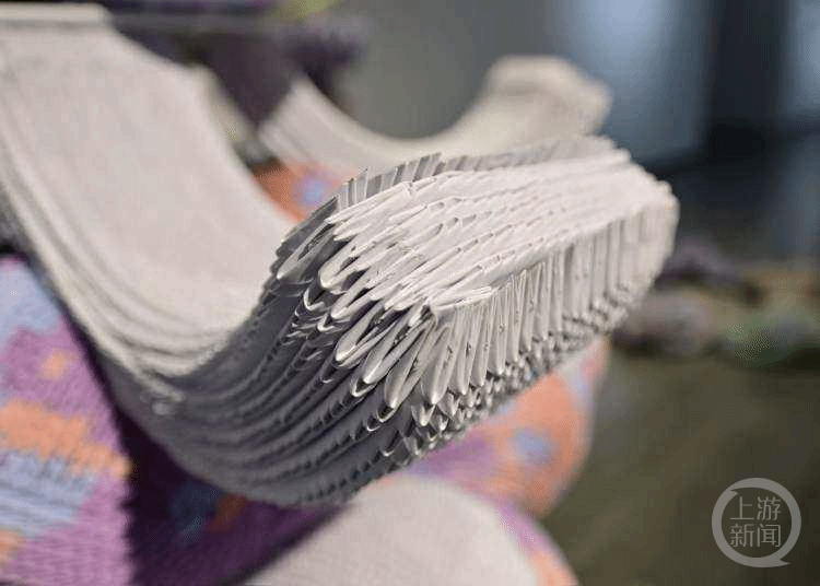 “很早我刚看到三角插这种民间工艺方式的时候,就觉得它是可以用制作雕塑的。”来自造型艺术学院的毕业生简珊珊告诉记者,自己这次带来的作品名叫《叠愿》。这件作品让人感到惊讶的其实是它消耗的材料体量。