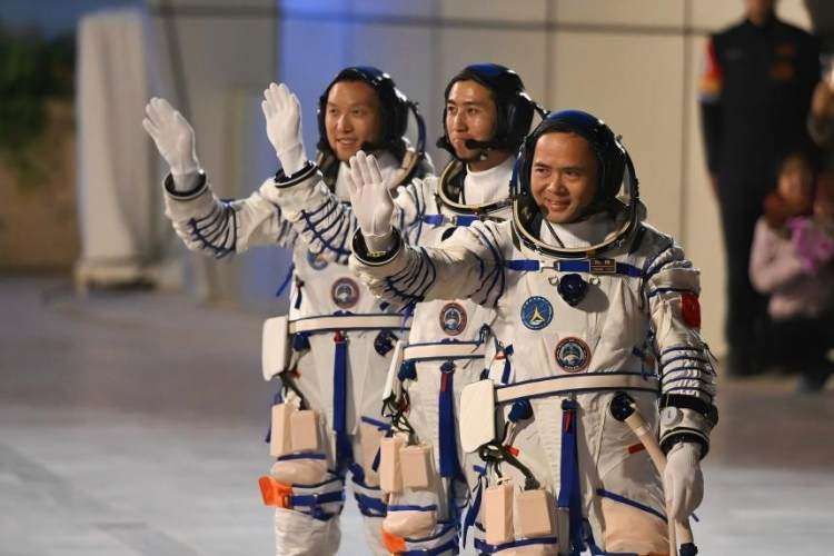 身上带有飞行任务标识的航天员 图/新华社