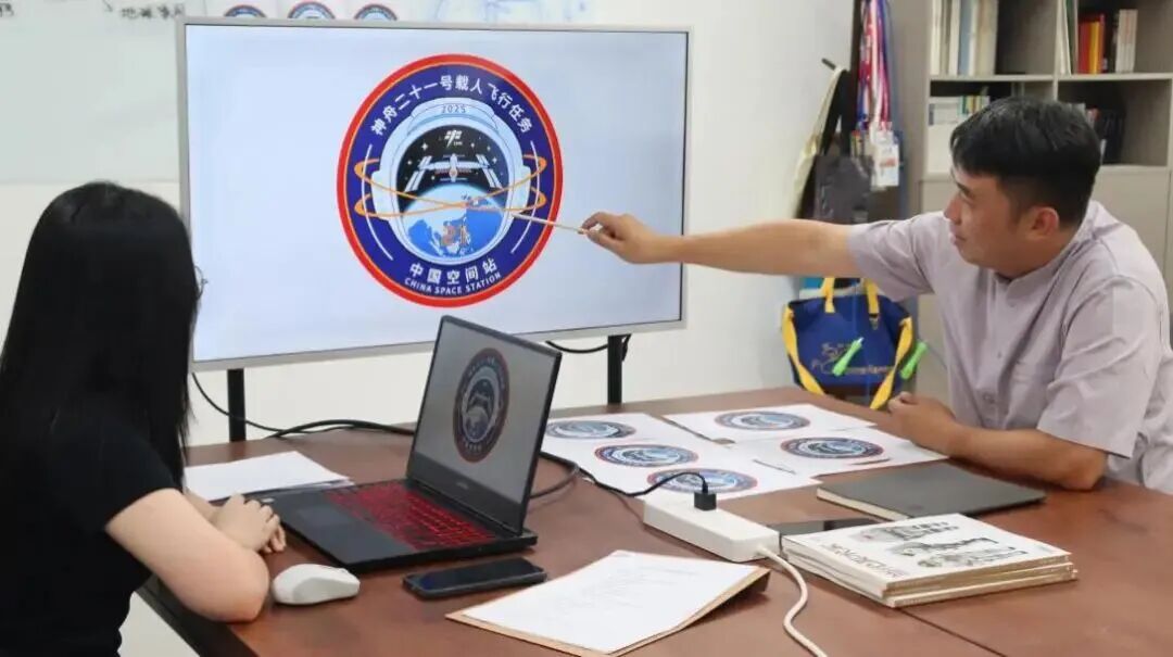 “在构思神舟二十一号载人飞行任务标识的初始阶段,我们对多种航天元素进行了筛选,最终将航天员头盔确定为创意起点——它既是航天员最具辨识度的符号之一,也是连接人、任务、宇宙三者之间的桥梁。”董恬说。