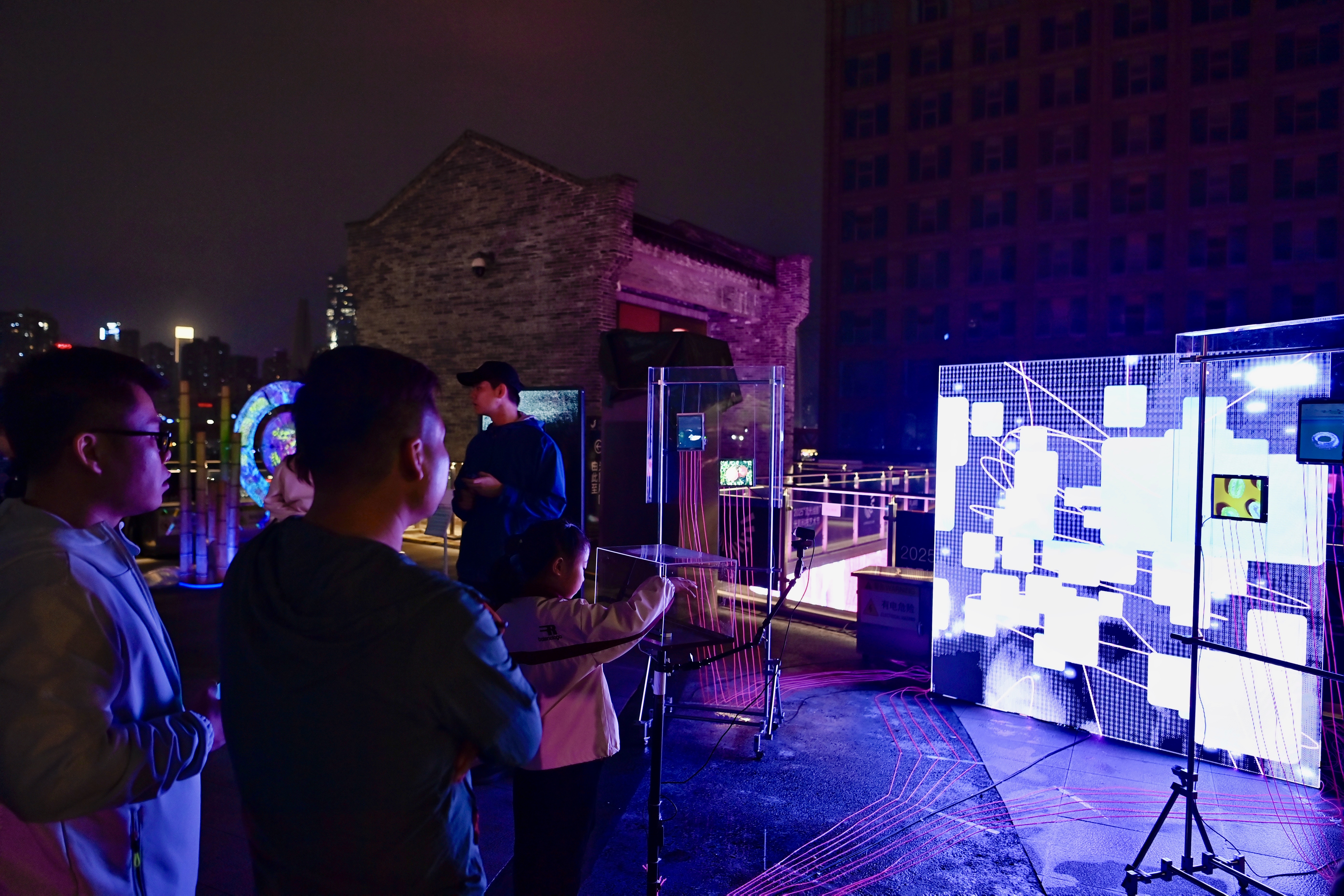 走进现场,一件件精美作品光影闪耀,将重庆开埠遗址公园装扮成了艺术的海洋。如,作品《心源画境图 2.0》,是一件能与观者的心境进行实时交互的艺术装置。它以一幅国画为起点,无数粒子从画面的色彩中缓缓流淌出来,在观看者的脑电波驱动下,可让人重新感悟中国画里的气韵生动。