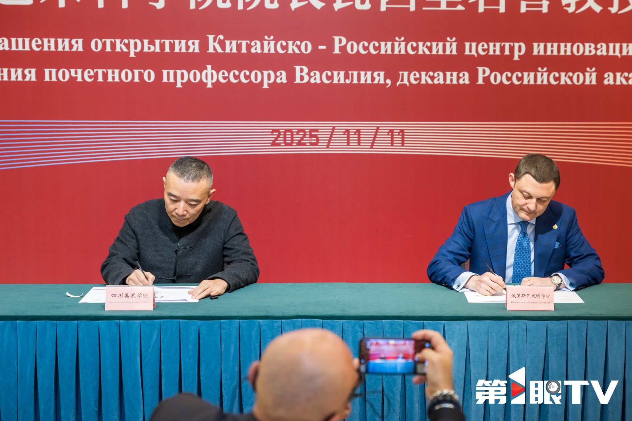 在仪式核心环节,焦兴涛与瓦西里・祖拉博维奇・采列捷利分别代表双方签署“四川美术学院中俄当代艺术创作与传播中心”合作协议。