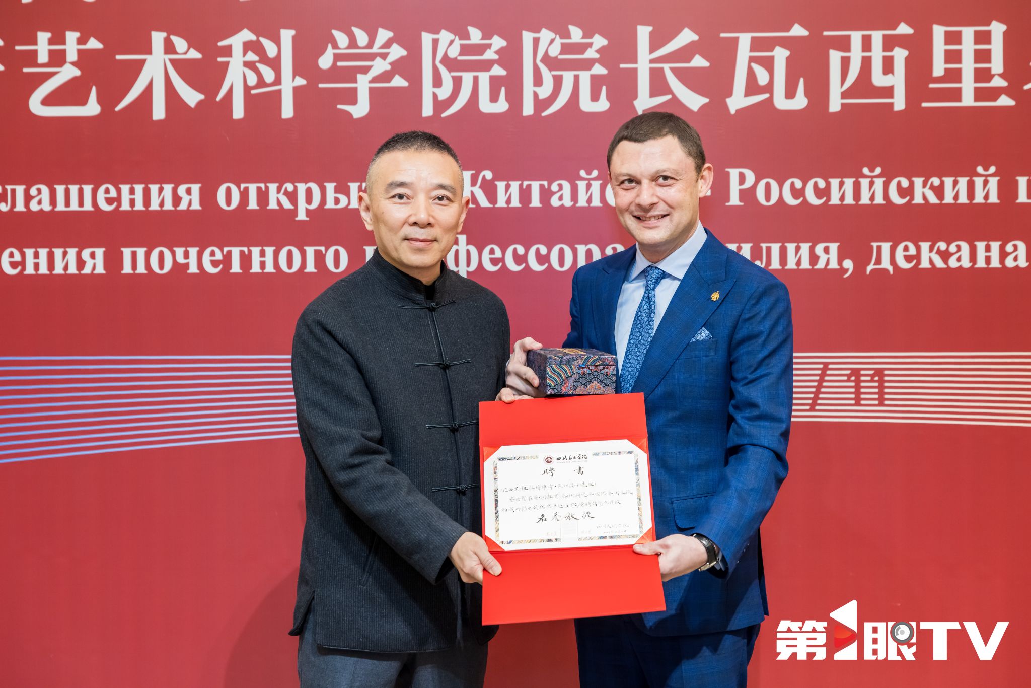 随后,焦兴涛为瓦西里・祖拉博维奇・采列捷利颁发聘书,正式聘任其为四川美术学院名誉教授。四川美术学院党委书记唐青阳和瓦西里·祖拉博维奇·采列捷利共同为“四川美术学院中俄当代艺术创作与传播中心”揭牌。