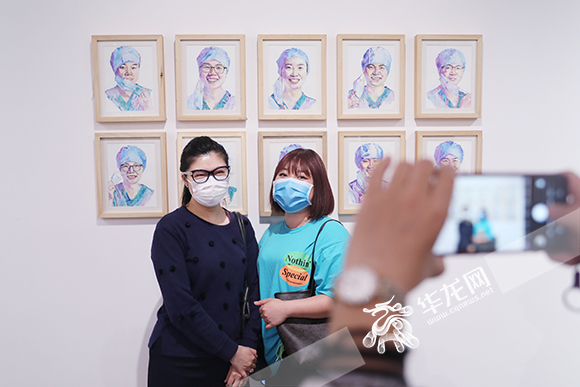 博士生毕业的刘畅去年12月正式成为了川美的教师,疫情期间除了上网课等工作,便是看照片绘制医疗队员们的画像。她告诉华龙网-新重庆客户端记者,之前也是看的照片作画,不曾想到竟会和自己画中的人在展览上相遇。明明是第一次见面,因为作品,二人像是阔别许久重逢的好友,紧紧拥抱在一起。“我太开心了。” 刘畅和杨雲翔齐声说道。