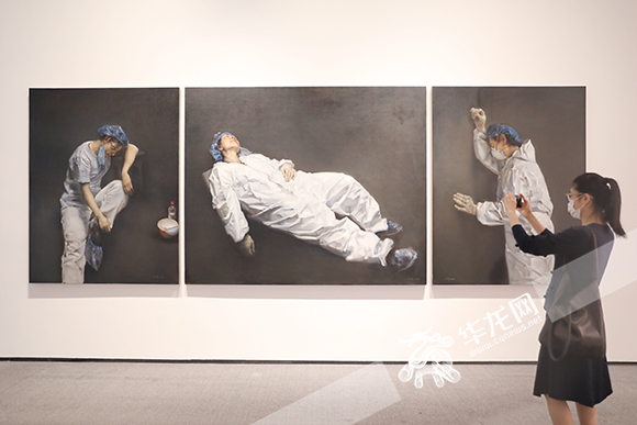 走进展厅,映入眼帘的便是一组宽5米高1.8的三联画《永恒与短暂》,这组作品由四川美术学院院长庞茂琨创作,他告诉华龙网-新重庆客户端记者,“艺术是对现实的反映。”川美有一个传统,就是艺术一直跟社会发展紧密相连、与时代共鸣。该作品选择了医务工作者在紧张的工作以后、从手术室下来或者是劳累一天以后非常困、非常劳累的一个瞬间来创作表达,表现出他们无私奉献的精神,同时体现整个医务工作者在这场战役中对国家、对民族的贡献。在处理方法上,简化背景,舍去了环境的很多东西,采用了重色,为了突出人物的某个动态和形态。实际在现实当中并没有这种暗黑的环境,这样创作是强化一种象征性。“创作就是这样,要进行一种相对的主观处理,融入自己平时的风格和个性化的创作语言,这样才能将你自己一贯的创作理念方法贯穿进你的作品,”庞茂琨说道。