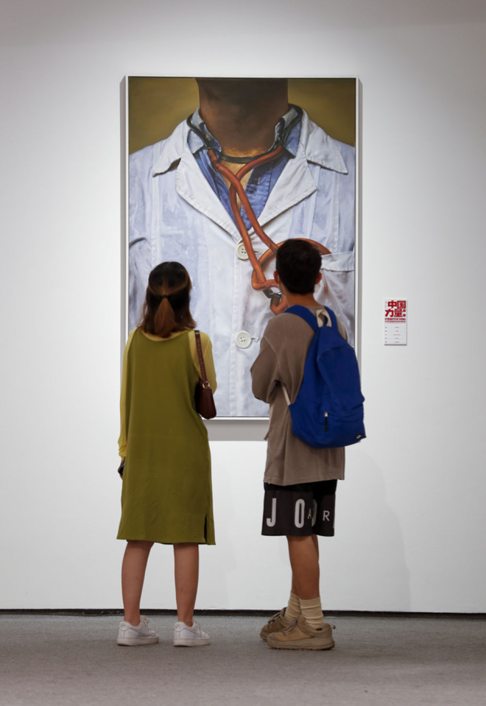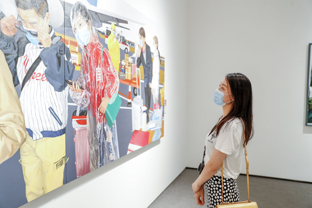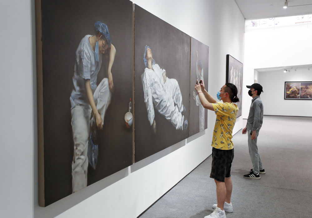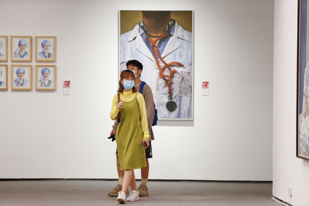 ↑5月7日,观众在参观抗疫主题作品《志愿者(油画)》。新华社发(黄伟 摄)