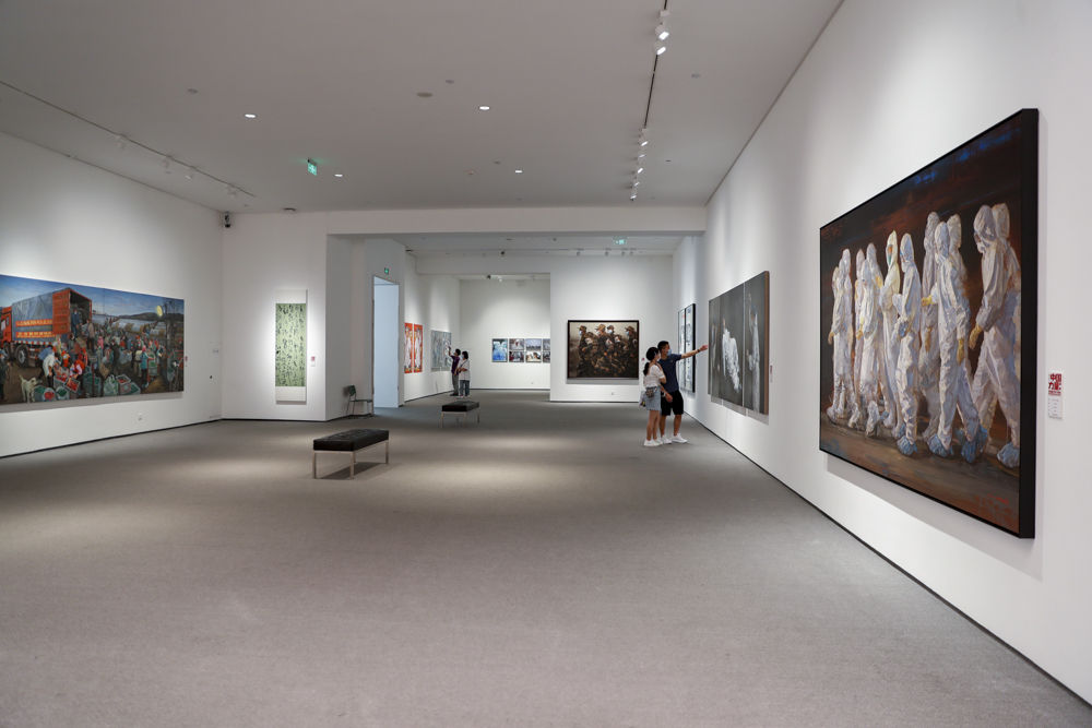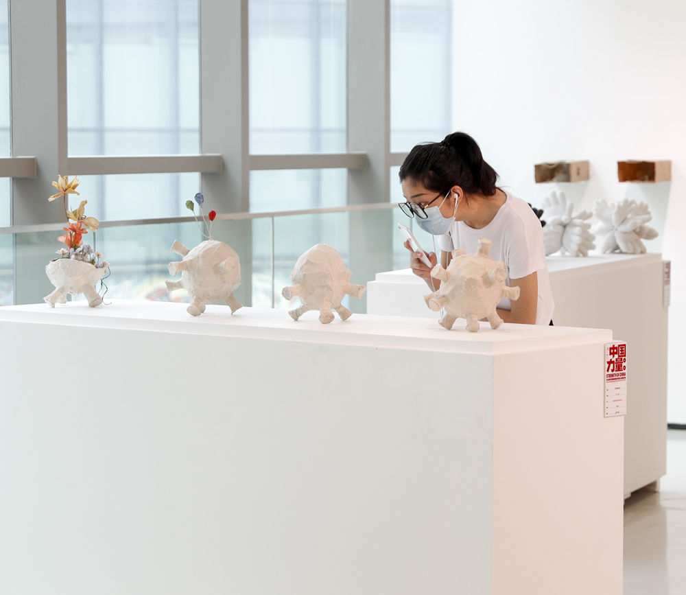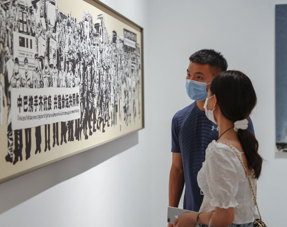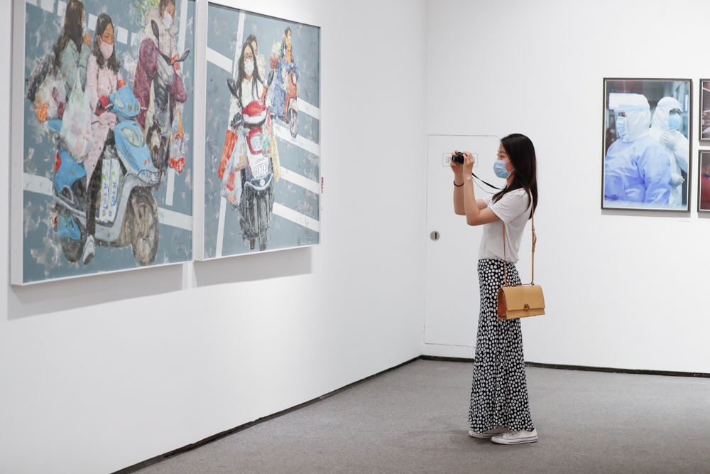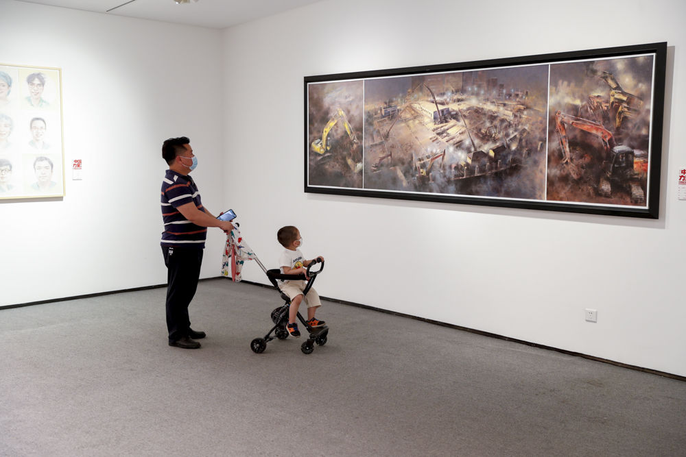 ↑5月7日,观众在“中国力量—新冠肺炎疫情防控主题创作展”上参观。新华社发(黄伟 摄)