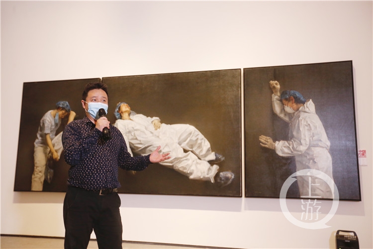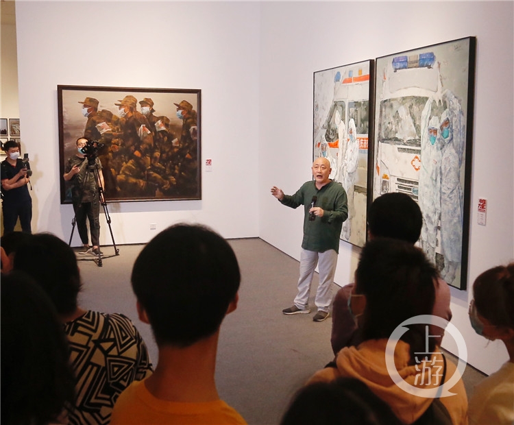 这么多位著名艺术家在自己的创作前授课,这对很多同学来说也是一次难得的经历。油画系的学生许艳就告诉上游新闻·重庆晨报记者,“这样的开学第一课非常生动,老师们的作品将这场抗疫战斗深刻地展现在我们面前,他们的亲身讲述,也给我们在专业上进行了答疑。”另一位油画系的学生韩青渝则说到:“这跟以往的课堂有很大的不同,这让我们可以更亲近作品,跟老师有一个更好的互动。”