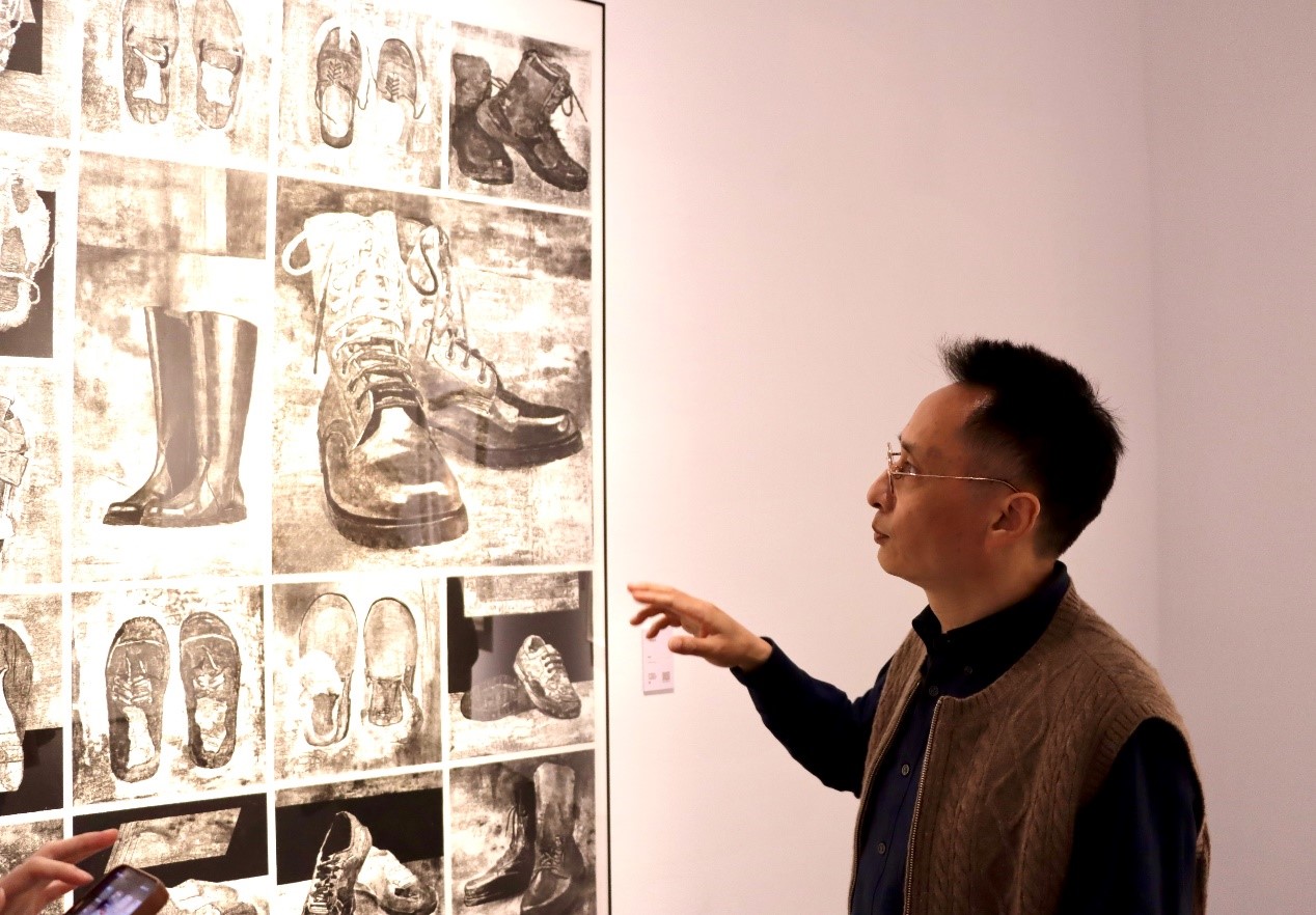展览现场,不少创作者分享了这些作品背后的创作故事。重庆大学艺术学院副教授肖力在解读其版画作品《一路走来》时表示,作品以不同时代的“鞋”为叙事主线,用组画形式串联起人民奋斗前行、生活从艰苦走向幸福的时代轨迹,“鞋,象征着脚踏实地、砥砺前行,这与廉洁文化求真务实、扎根群众、实干为民的内核高度契合”。内蒙古艺术学院美术学院副院长王茹在介绍其铜版画作品《弈间首廉——每一步都为人民》时谈到,作品以围棋为核心意象,用黑白两色构建双层棋盘的超现实空间,将廉洁从政理念具象化。棋盘象征权力运行的岗位与权责,黑白棋子寓意正邪、公私之辨,上下悬浮棋盘暗合“台上与台下”“明处与暗处”的监督逻辑。她表示:“落子无悔,正如用权不可任性。创作这件作品,就是想表明艺术家也在关注廉洁,公职人员每一步权力的行使都要站稳人民立场、守住廉洁底线。”