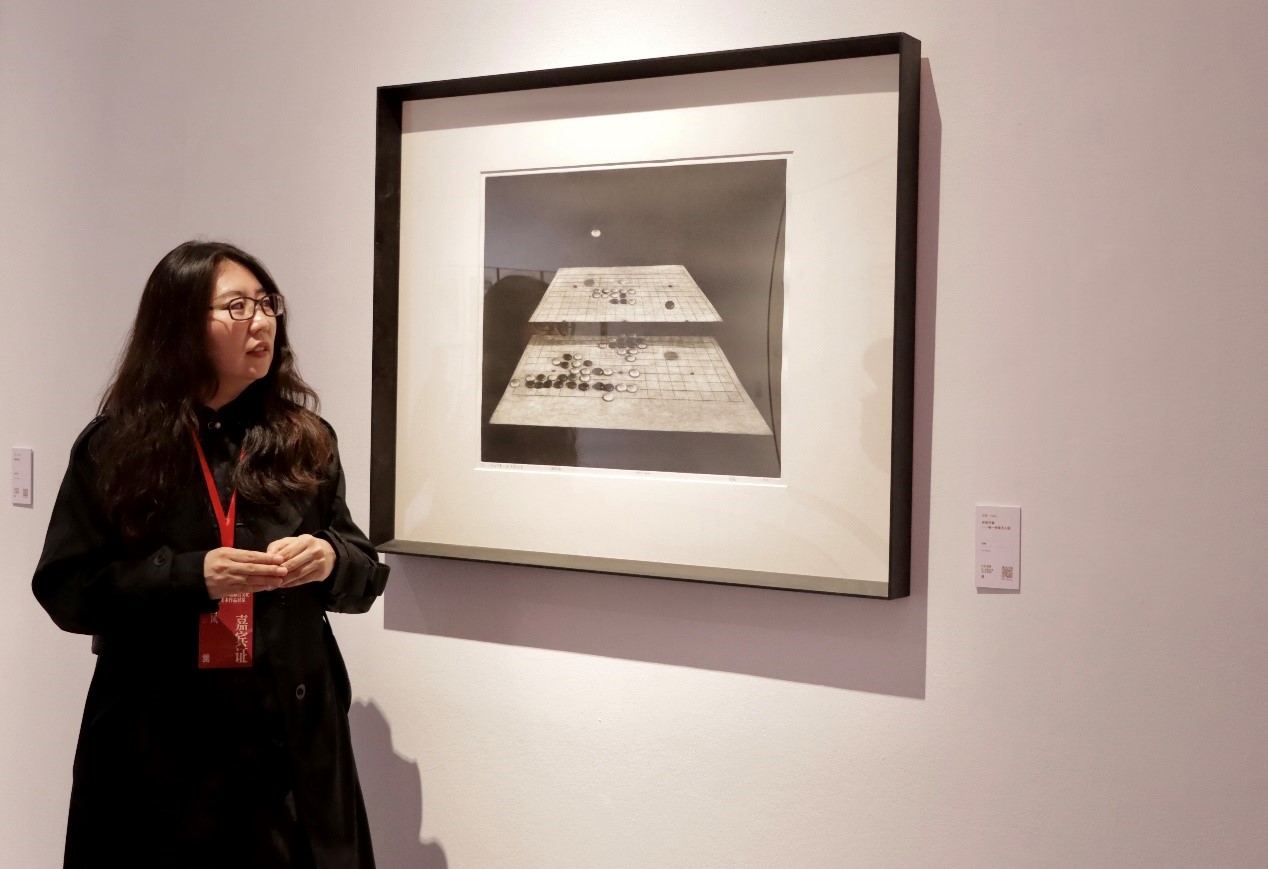 内蒙古艺术学院美术学院副院长王茹介绍其铜版画作品《弈间首廉——每一步都为人民》。当代党员杂志社实习记者 宋怡萱 摄