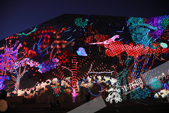 灯光墙绘上有森林、飞鸟、恐龙等等。华龙网-新重庆客户端记者 谢鹏 摄