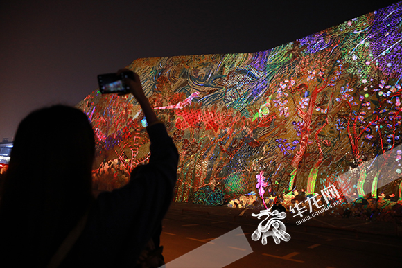 值得一提的是,以罗中立美术馆为载体的《沐光森林》灯光秀,作者使用投影技术,在这座巨幅涂鸦墙上进行创作,为涂鸦纹理赋予了生命,将它们变成了光怪陆离的异草奇花,或走兽飞鸟。在这个魔幻的森林中,万物皆为精灵,万物皆有生命。《沐光森林》创作者之一,四川美术学院公共艺术学院公共艺术系主任周波接受华龙网-新重庆客户端记者采访时表示,这部作品是“万物精灵”系列光影作品的第一篇章,未来还会不断地升级,用投影艺术为人们诠释出一个新的奇妙世界。