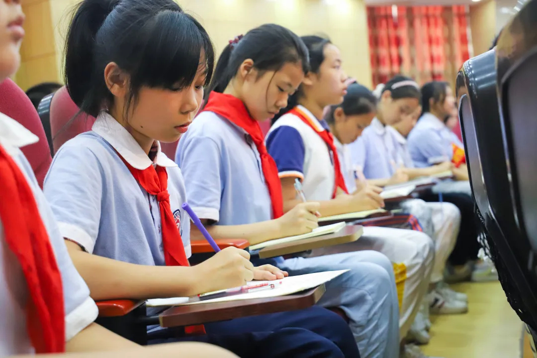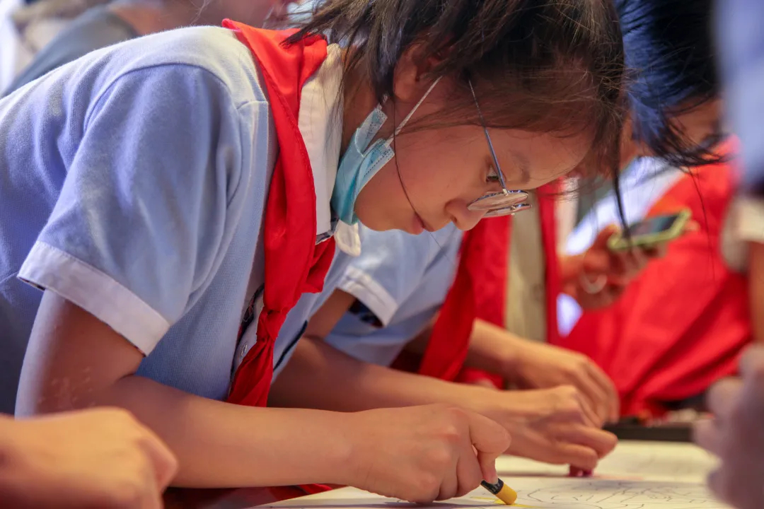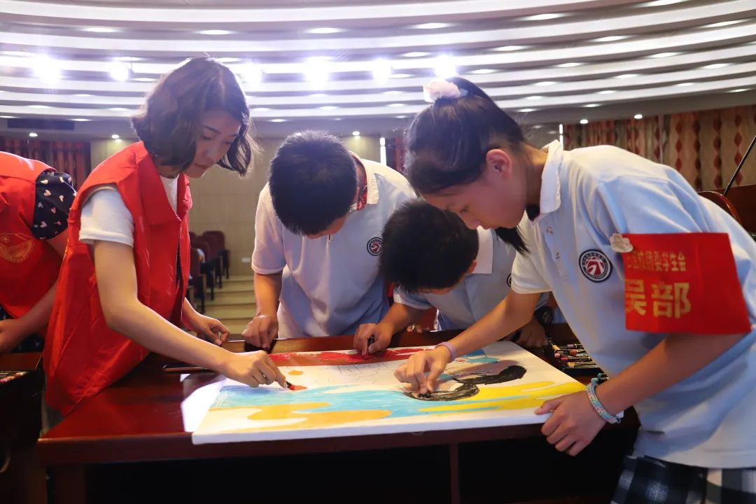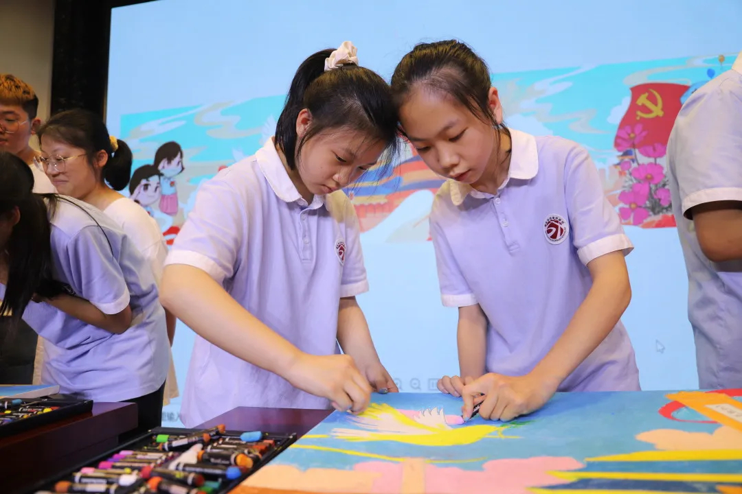 “这边涂红色,这边涂绿色......”为进一步巩固同学们对党史和美育的了解,大家还一起进行了红色美术作品的绘制。在四川美术学院师生的带领下,杨家坪中学B区的同学们分批次轮流上台进行绘画,同学们情绪高涨、反映热烈,积极地用自己手中的画笔表达对党的热爱和对革命先烈的缅怀之情。