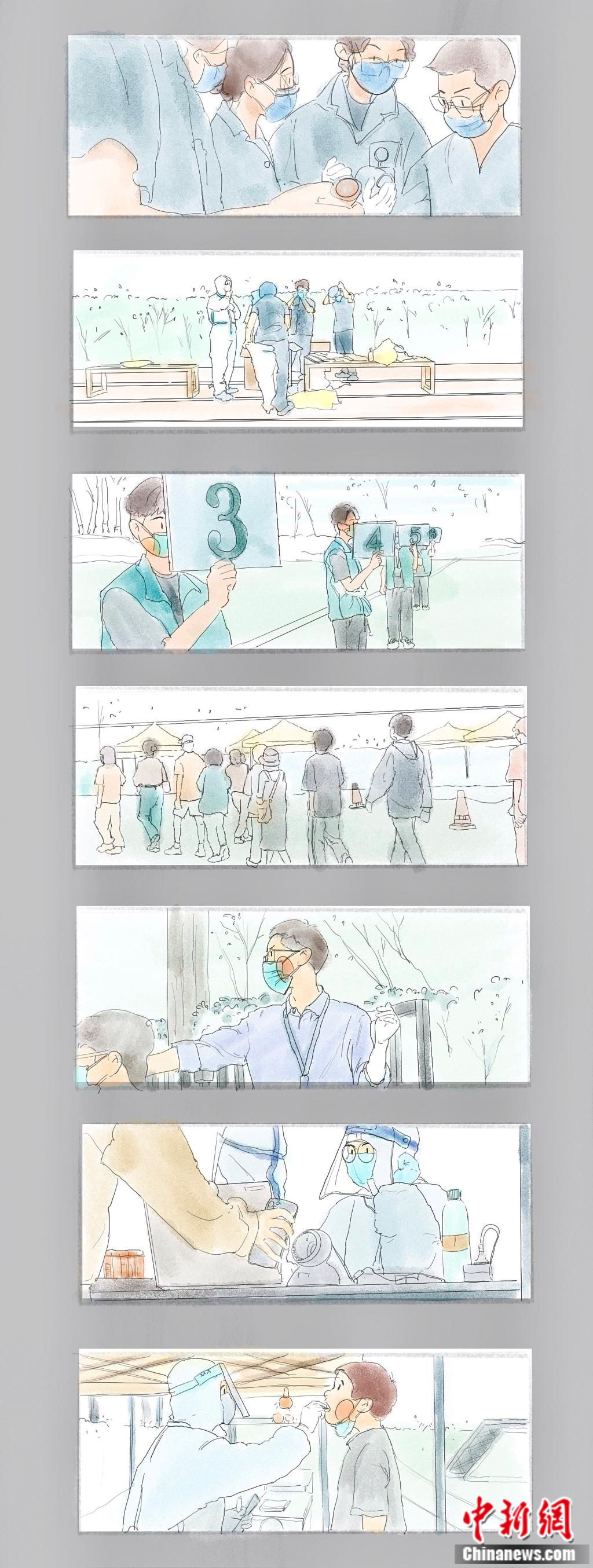 记者了解到,师生的创作来源于一个个有趣的故事。3月16日下午,四川美术学院组织第三轮核酸检测,影视动画学院教师师涛两岁的儿子,抬着头喊“妈妈,我要做核酸,我要做核酸。”这个画面让师涛十分感触,“我们和家人、朋友、医务人员共同抗疫,即便是两岁的小朋友也那么配合。”师涛以此为灵感,创作了《一起去做核酸吧》, 记录这感人的瞬间。