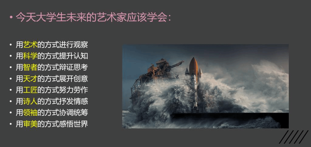 ★怎样拓展探索艺术思维和科学思维的跨界教育新模式,成为了今天的必然。超越艺术来看艺术的时候,可能会发现这样那样的问题;超越科技,用艺术的角度看科学问题的时候,也许有新的理解、新的判断,怎么把科技前沿最新的成果实时转化成教学资源,需要大家认真思考。